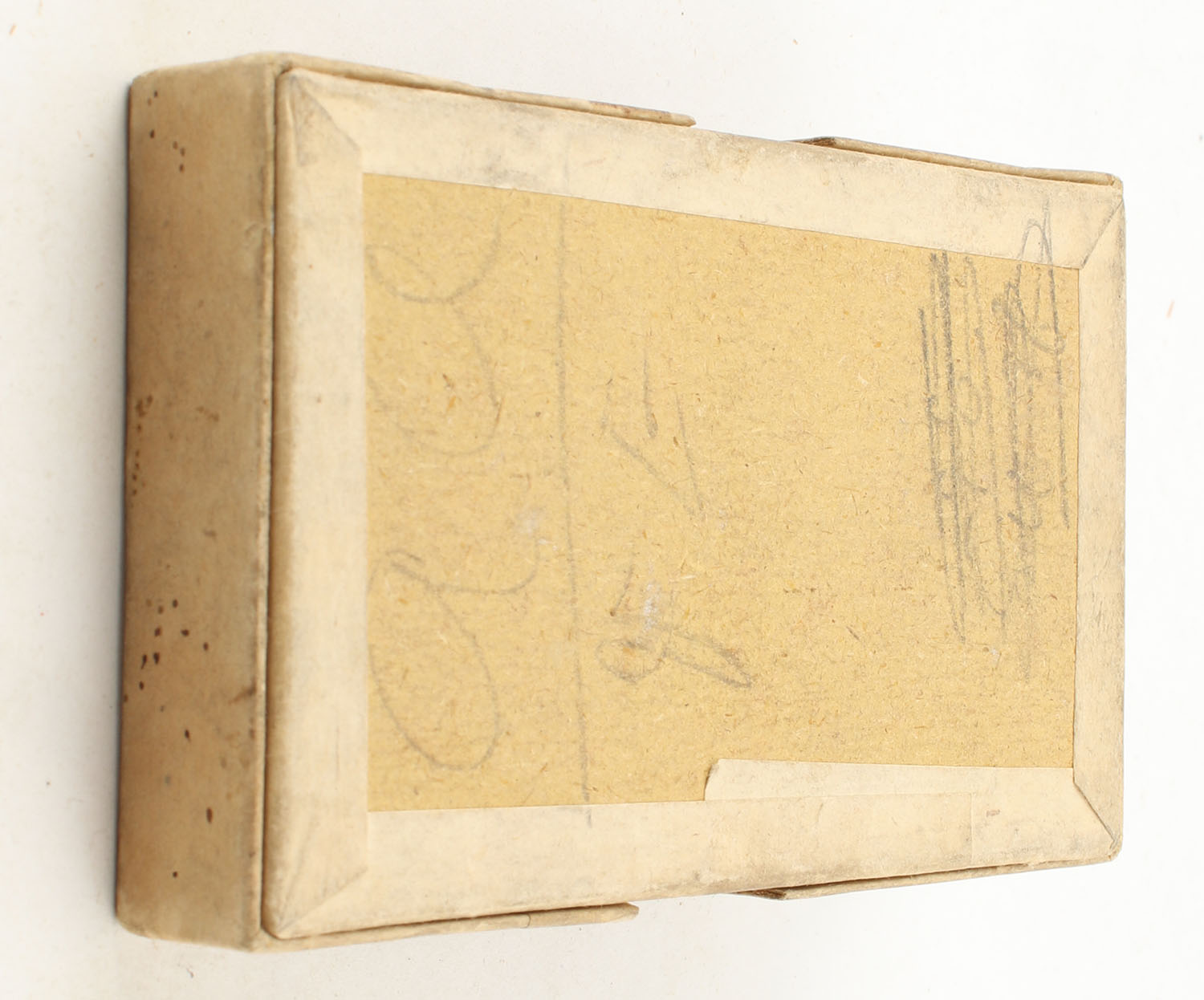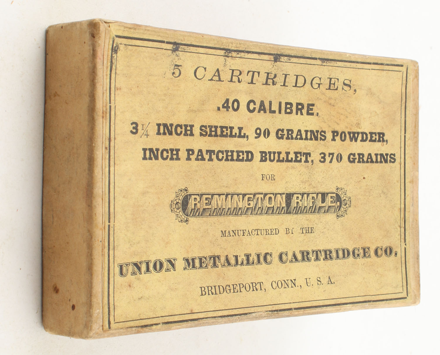 UMC, Center Fire Cartridges, .40 Cal., 3 1/4'' Shell, 90 Grains Powder, Inch patched bullet, 370 Grains, For Remington Rifle, Full (5rds.), 2pc. Buff box with buff & black label, box is very solid with good color, has light age soiling, some writing to bottom, ammo is excellent. Grade: Excellent - Value: 50 to 150