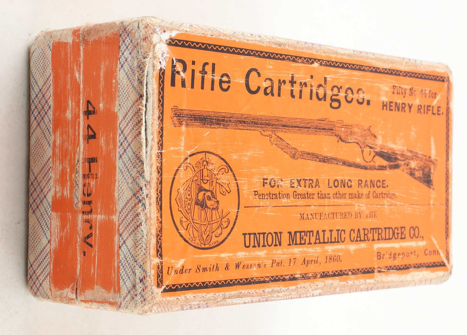 UMC, Rifle Cartridges, .44 Henry Rifle, Empty, 2pc. For Extra Long Range, Purple fabric box with orange top & orange side sealing label, box is very solid with excellent color, box has scuffing, edge & corner wear, labels are 100% intact. Grade: Very Good ++ - Value: 1000 to 3000