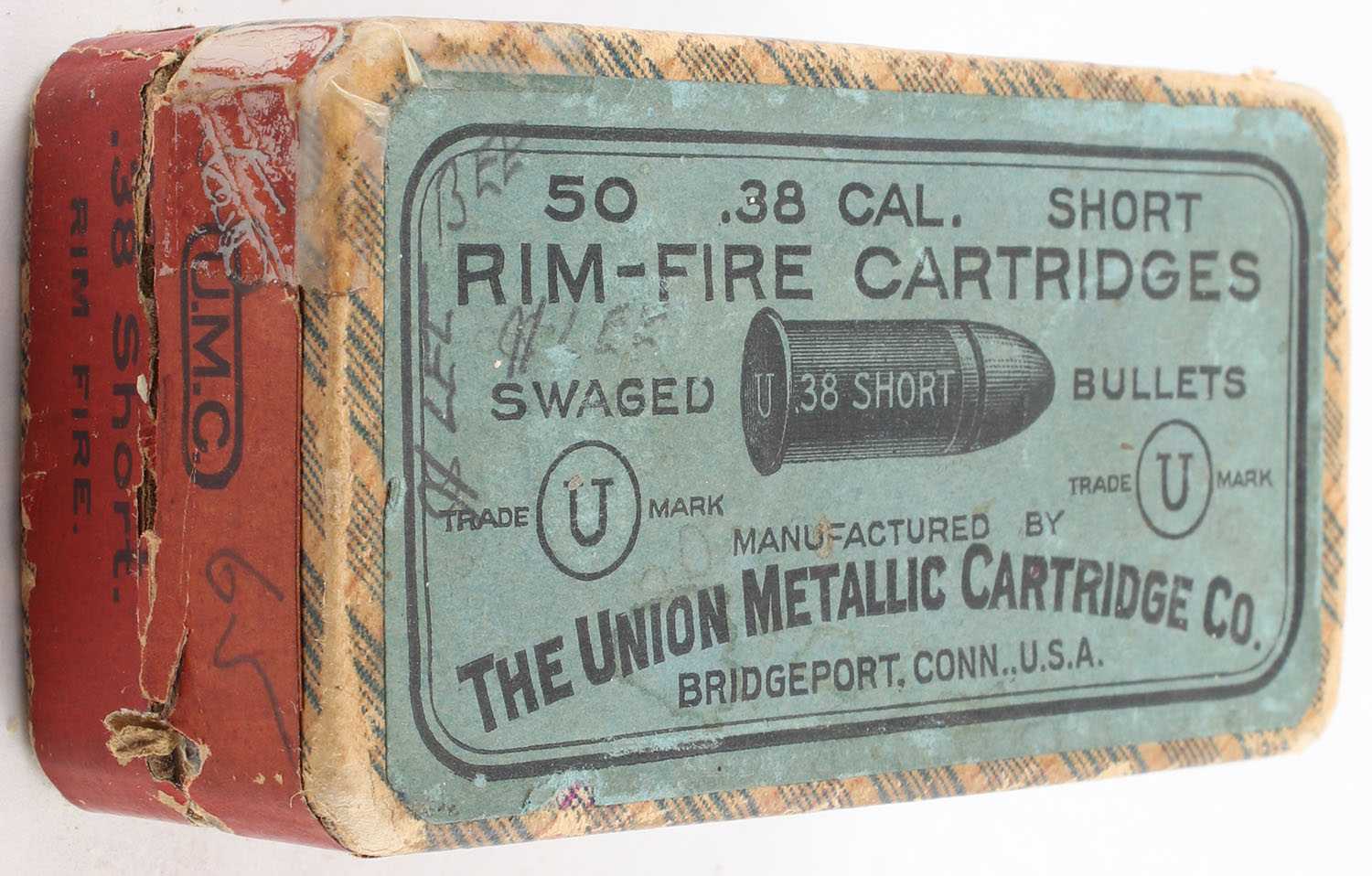 UMC, Rim-Fire Cartridges, .38 Short Rim Fire, Swaged Bullets, Partial 41rds. Mixed H/S, 2pc. Purple fabric box with blue top & red side sealing label, box is solid with very good color, has light age soiling, edge wear, side label is 50% intact, ammo is fair. Grade: Good ++ - Value: 10 to 40