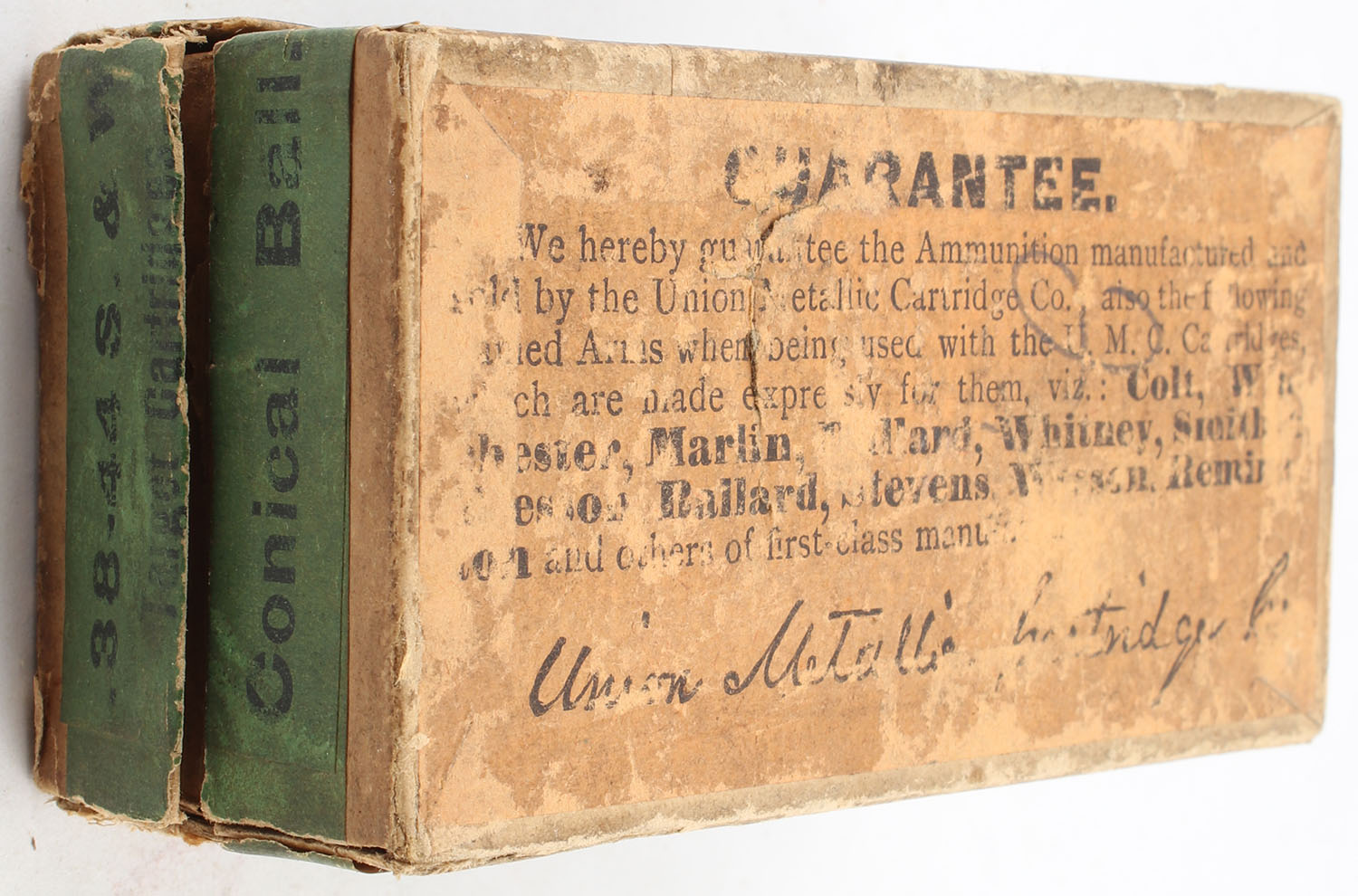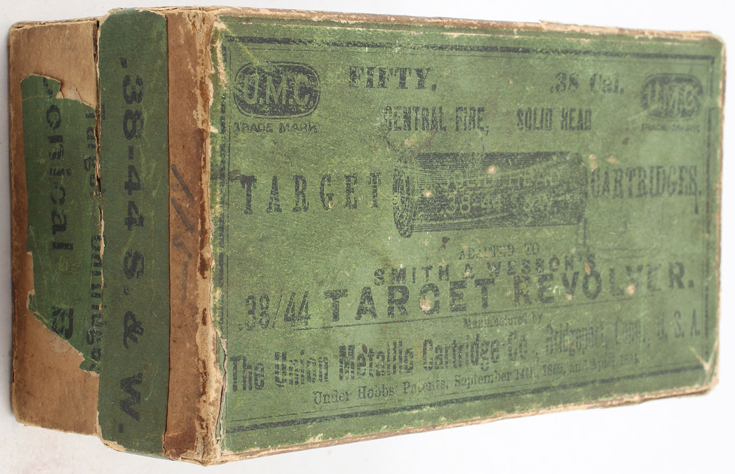 UMC, Target Cartridges, .38-44 Smith & Wesson, Solid Head Central Fire, Conical Ball, Partial 10rds. 1pc. Buff box with green top & side sealing label, box has age soiling, scuffing, edge & corner wear, top has seam splits to corners, side label is about 50% intact, ammo is very good. Grade: Good ++ - Value: 10 to 60