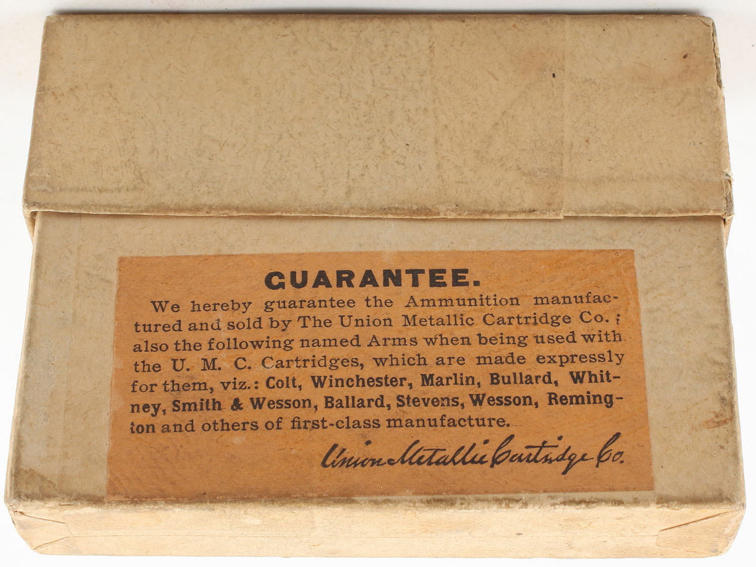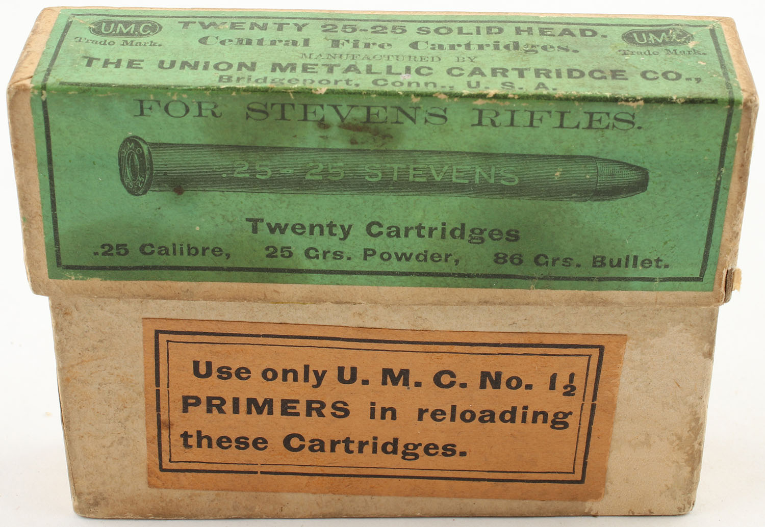 UMC, Central Fire Cartridges, .25-25 Stevens, 86 Grain Bullet, Full, 2pc. Buff box with green top & buff side label, box is very solid with good color, has light age soiling, minor edge & corner wear, labels are intact, ammo is excellent. Grade: Very Good ++ - Value: 50 to 150
