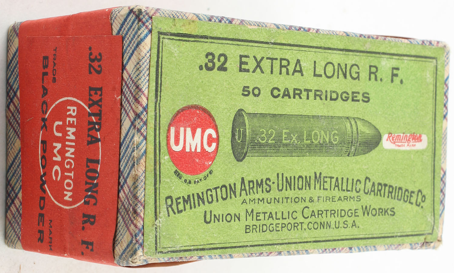 REM-UMC, .32 Extra Long Rim Fire, Black Powder, FULL & SEALED, 2pc. Blue fabric box with green top & red side sealing labels, box is very solid with excellent color, very minor corner wear, edges are sharp & crisp, labels are intact. Grade: Excellent ++ - Value: 50 to 150
