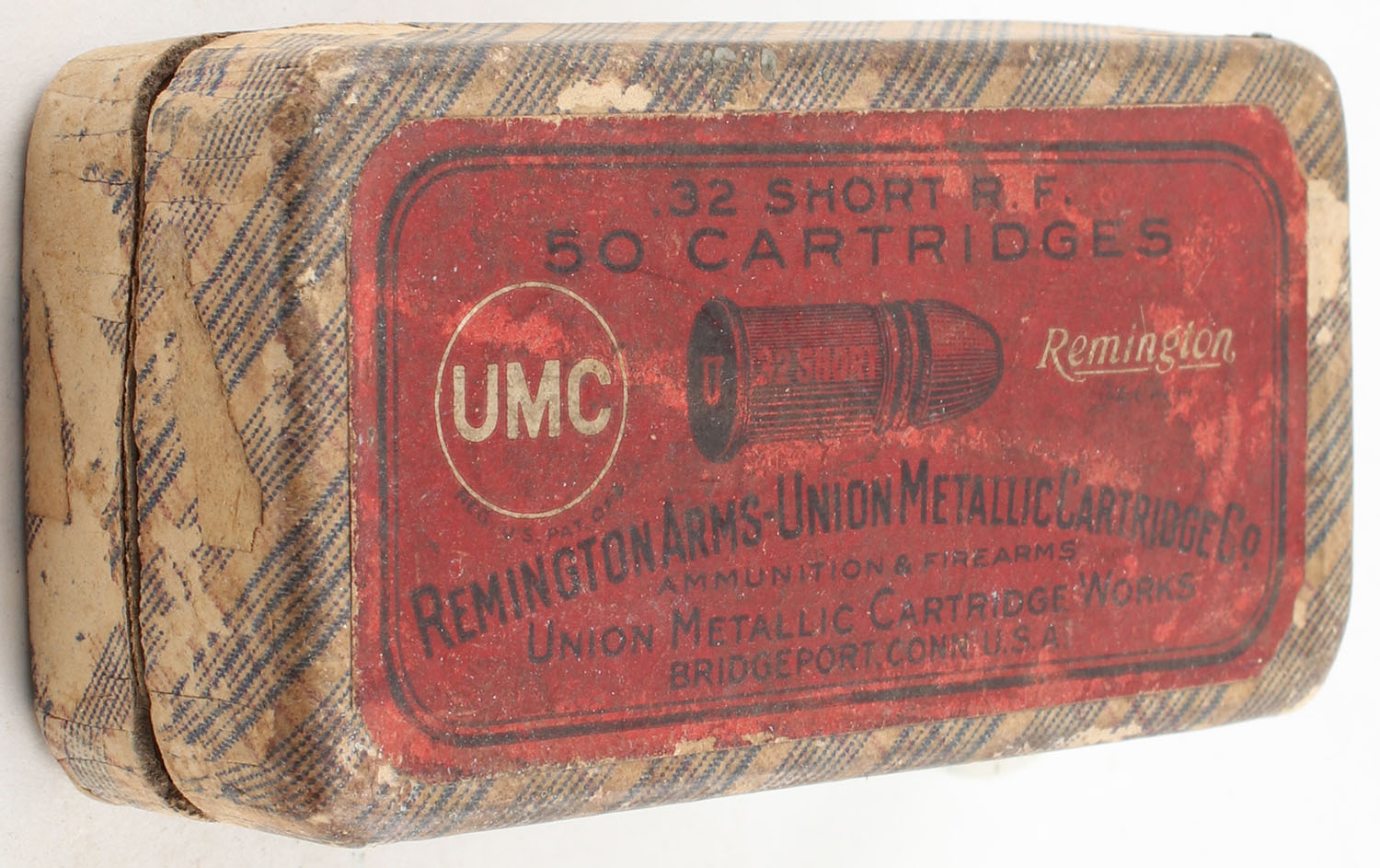REM-UMC, .32 Short Rim Fire, Full, 2pc. Blue fabric box with red top & side sealing labels, box is solid with very good color, age soiling, shelf wear, edge & corner wear, labels are intact, ammo is very good. Grade: Very Good + - Value: 30 to 90