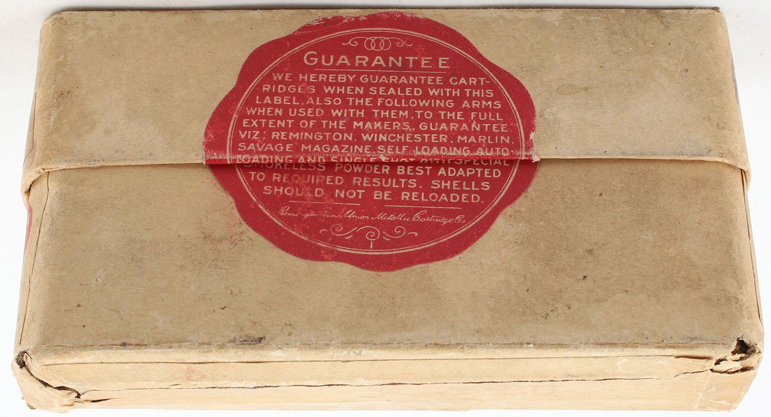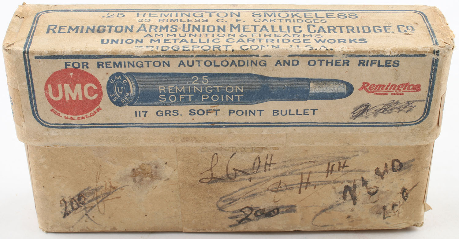 REM-UMC, Smokeless, .25 Remington, Rimless C.F. Cartridges, FULL & SEALED, 2pc. Buff box with buff & blue label, box is solid with very good color, box has writing to side, edge & corner wear, shelf wear, labels are intact. Grade: Very Good ++ - Value: 20 to 60