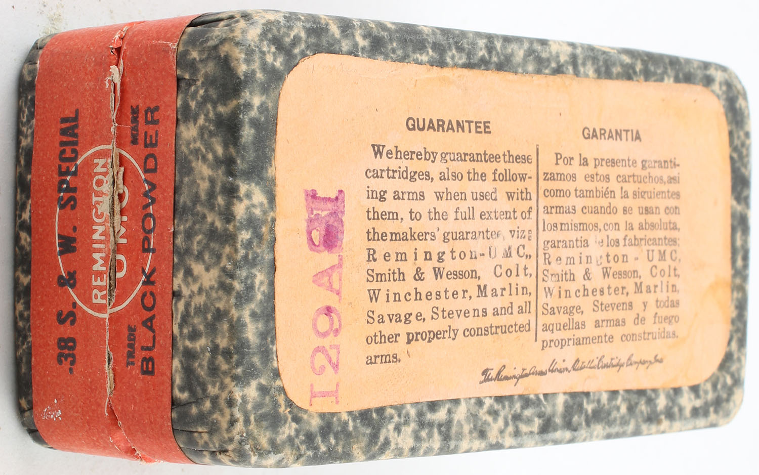 REM-UMC, Central Fire Cartridges, .38 Smith & Wesson Special, 158 Grs. Bullet, FULL & SEALED, 2pc. Black mottled box with red top & side sealing labels, box is very solid with excellent color, very minor corner wear, edges are crisp, labels are intact. Grade: Excellent ++ - Value: 50 to 200