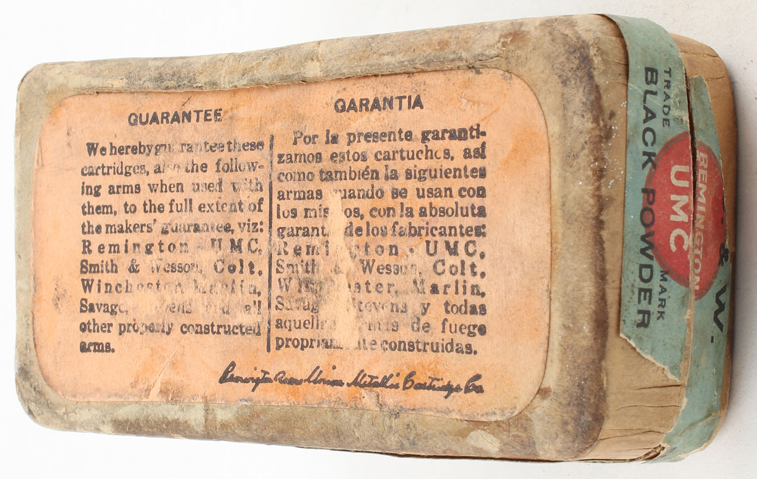 REM-UMC, Central Fire Cartridges, .32 Smith & Wesson, 88 Grain Bullet, Full, 2pc. Buff box with blue top & side sealing labels, box has age soiling, scuffing, edge & corner wear, side sealing label is partially torn, ammo is very good. Grade: Very Good - Value: 10 to 40