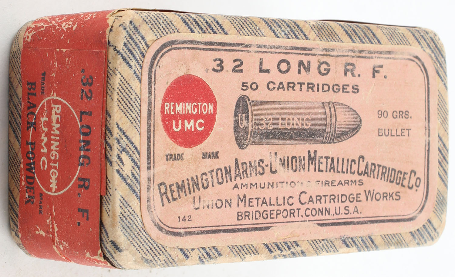 REM-UMC, .32 Long Rim Fire, 90 Grain, FULL & SEALED, 2pc. Purple fabric box with pink top & red side sealing labels, box is very solid with excellent color, minor age soiling, light edge & corner wear, labels are intact. Grade: Excellent + - Value: 100 to 400