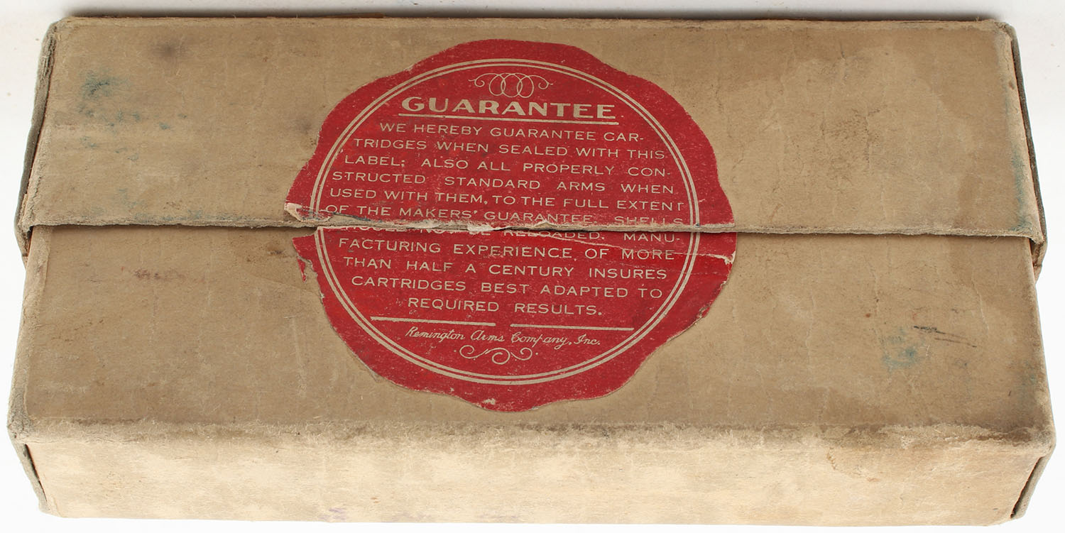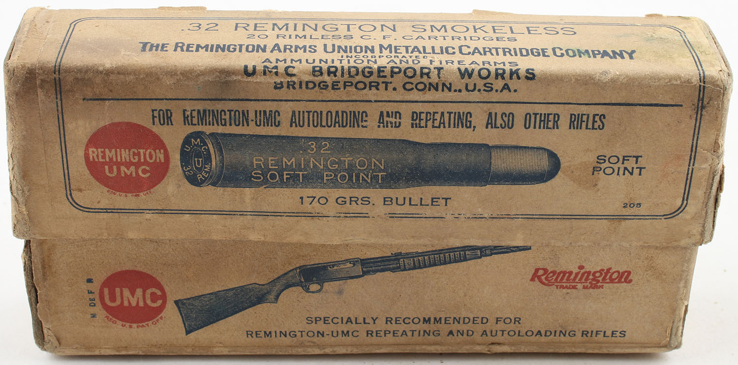 REM-UMC, .32 Remington, Smokeless Powder, 170 Grain Soft Point Bullet, Partial 14rds. 2pc., buff box with buff labels, box is solid with great color, minor age soiling, light edge & corner wear, labels are intact, ammo is excellent. Grade: Very Good ++ - Value: 10 to 40