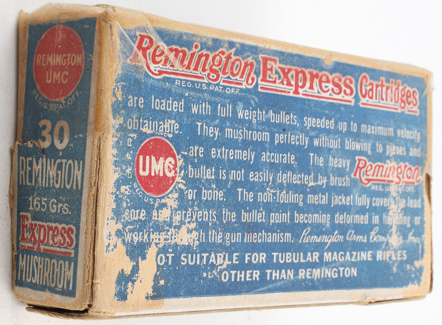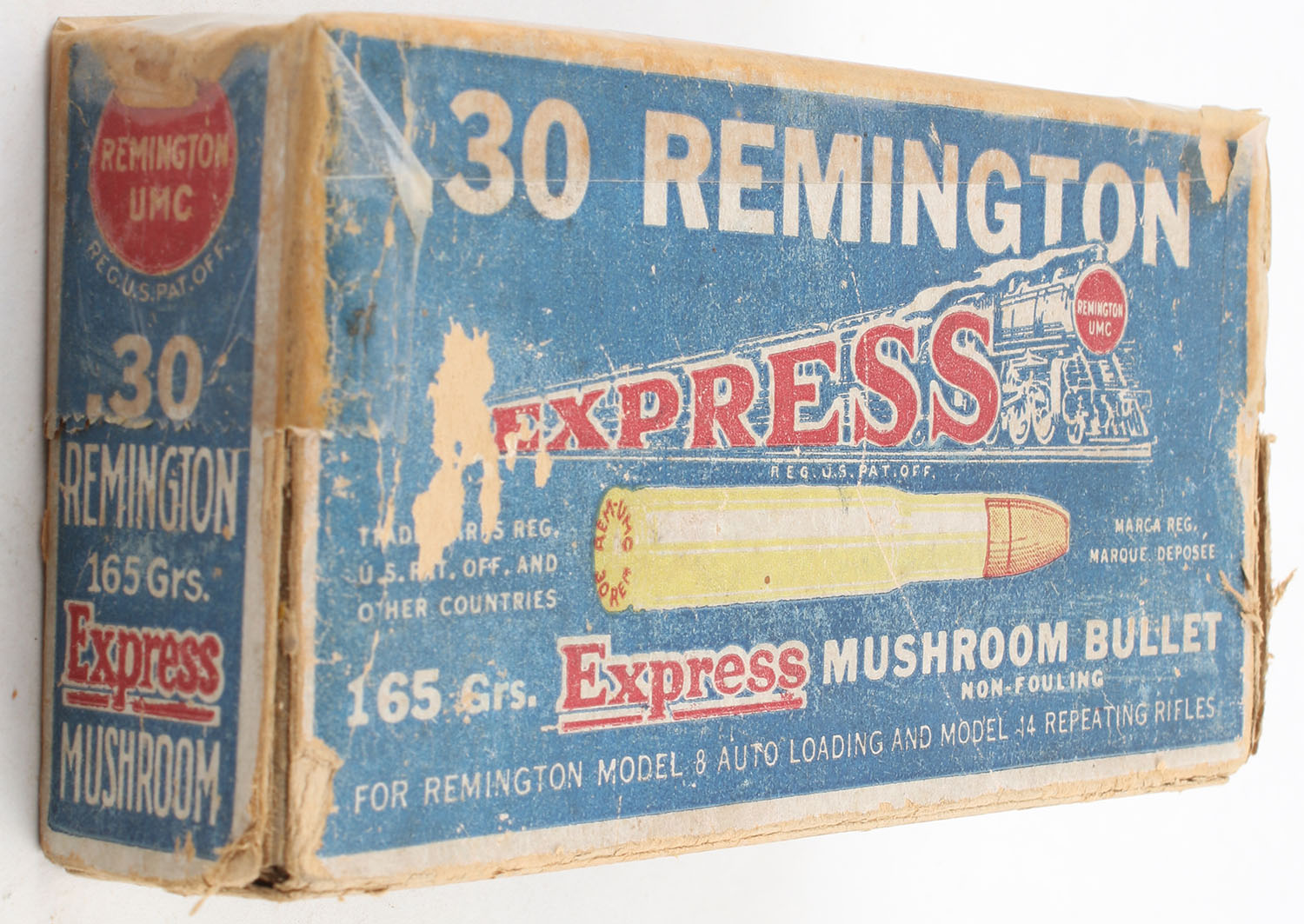 Remington, Express, .30 Remington, 165 Grain Express Mushroom Bullet, Full, 1pc. Blue white & red train box, box has a torn and missing top side, has tape repairs, age soiling, edge & corner wear, end flaps are torn with tape repairs, scuffing, ammo is very good. Grade: Good - Value: 80 to 300