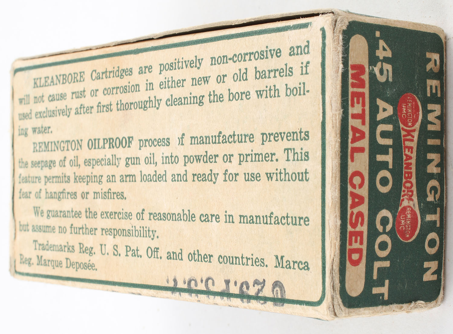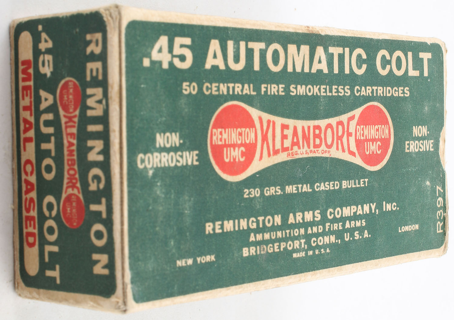 Remington, Kleanbore, .45 Automatic Colt, 230 Grain Metal Cased Bullet, Full, 1pc. Green buff & red dog bone box, box is very solid with excellent color, has shelf wear, light edge & corner wear, end flaps are solid, ammo is excellent. Grade: Excellent - Value: 40 to 60