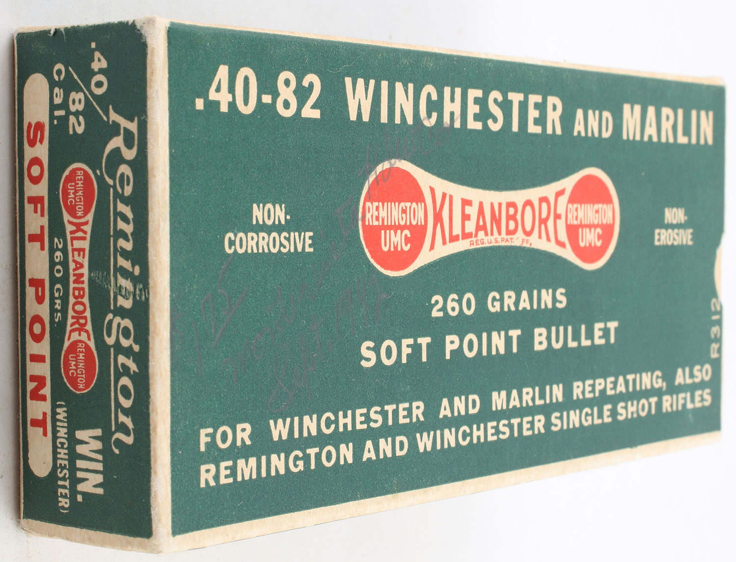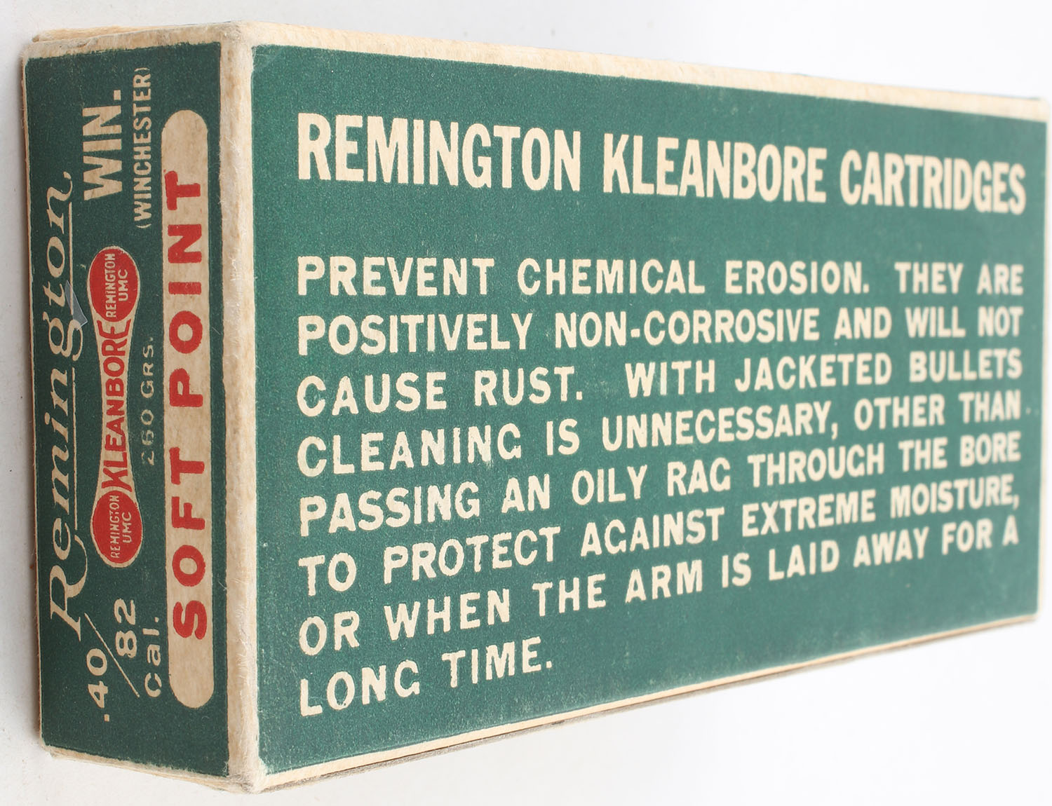 Remington, Kleanbore, .40-82 Winchester and Marlin, 260 Grains Soft Point Bullet, Full, 1pc. Green white & red dog bone box, box is very solid with excellent color, corners are mostly sharp, edges are crisp, has light writing to front, end flaps are solid, ammo is excellent. Grade: Excellent + - Value: 100 to 400