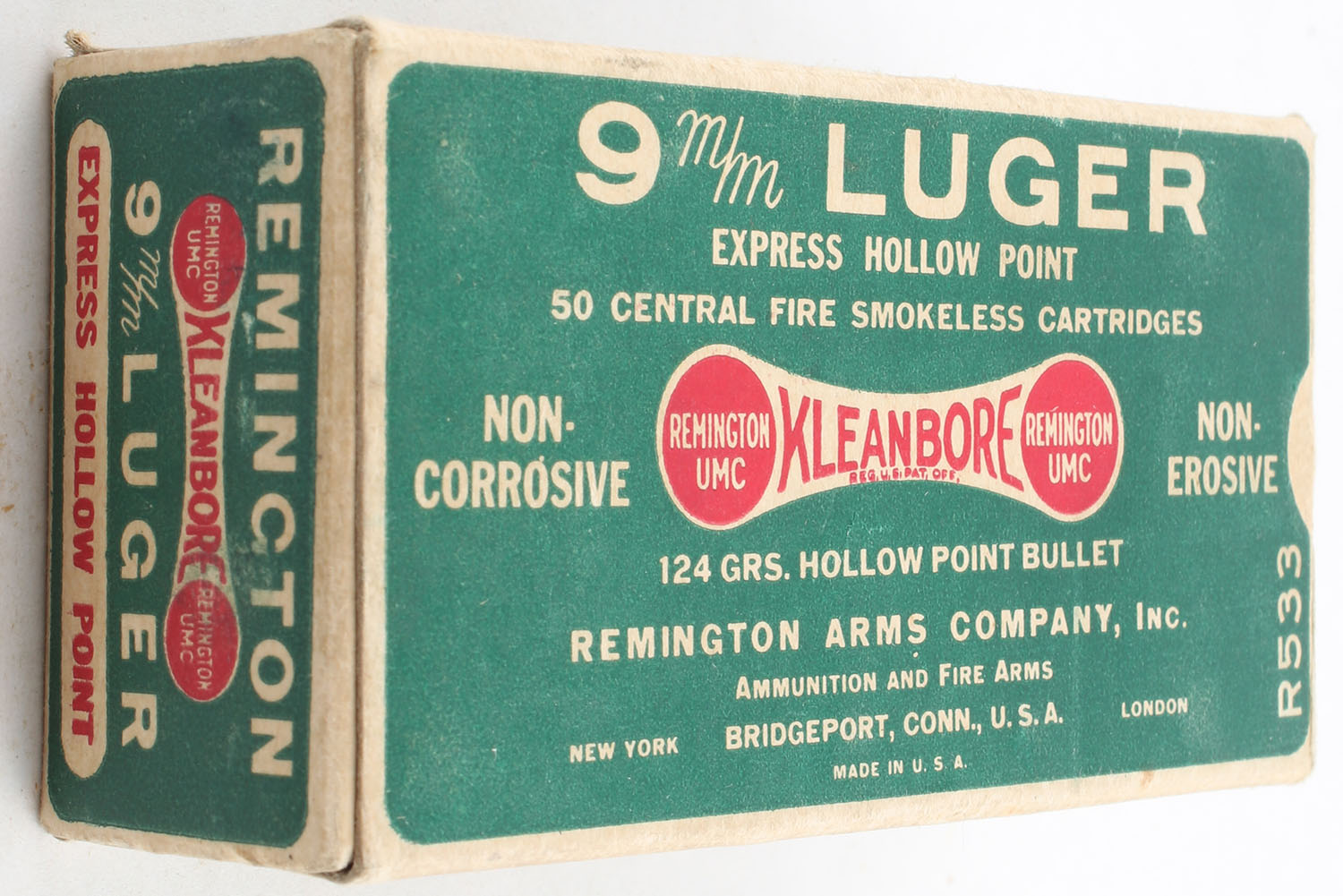 Remington, Kleanbore, 9mm Luger, 124 Grain Express Hollow Point Bullet, Full, 1pc. Green buff & red dogbone box, box is very solid with excellent color, has very minor edge wear, end flaps are solid, ammo is excellent. Grade: Excellent + - Value: 30 to 90