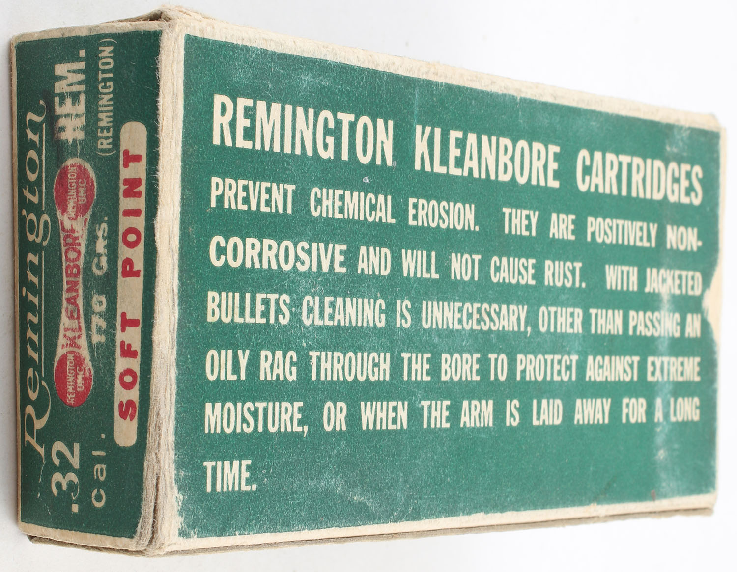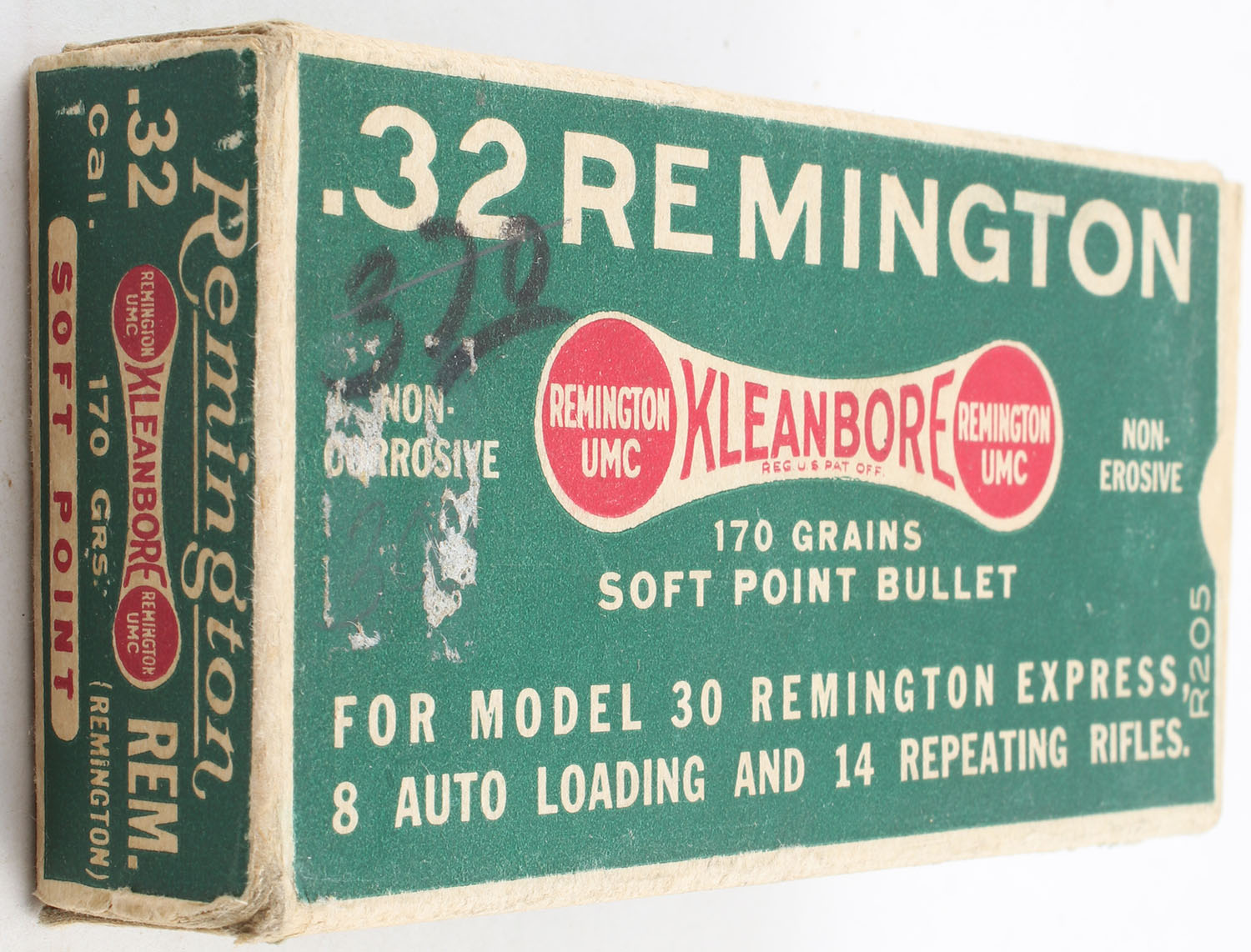 Remington, Kleanbore, .32 Remington, 170 Grain Soft Point Bullet, Full with 17rds. Being correct, 1pc. Green buff & red dogbone box, box is very solid with excellent color, has edge & corner wear, light scuffing, has some writing to front, end flaps are solid, ammo is excellent. Grade: Excellent - Value: 20 to 60
