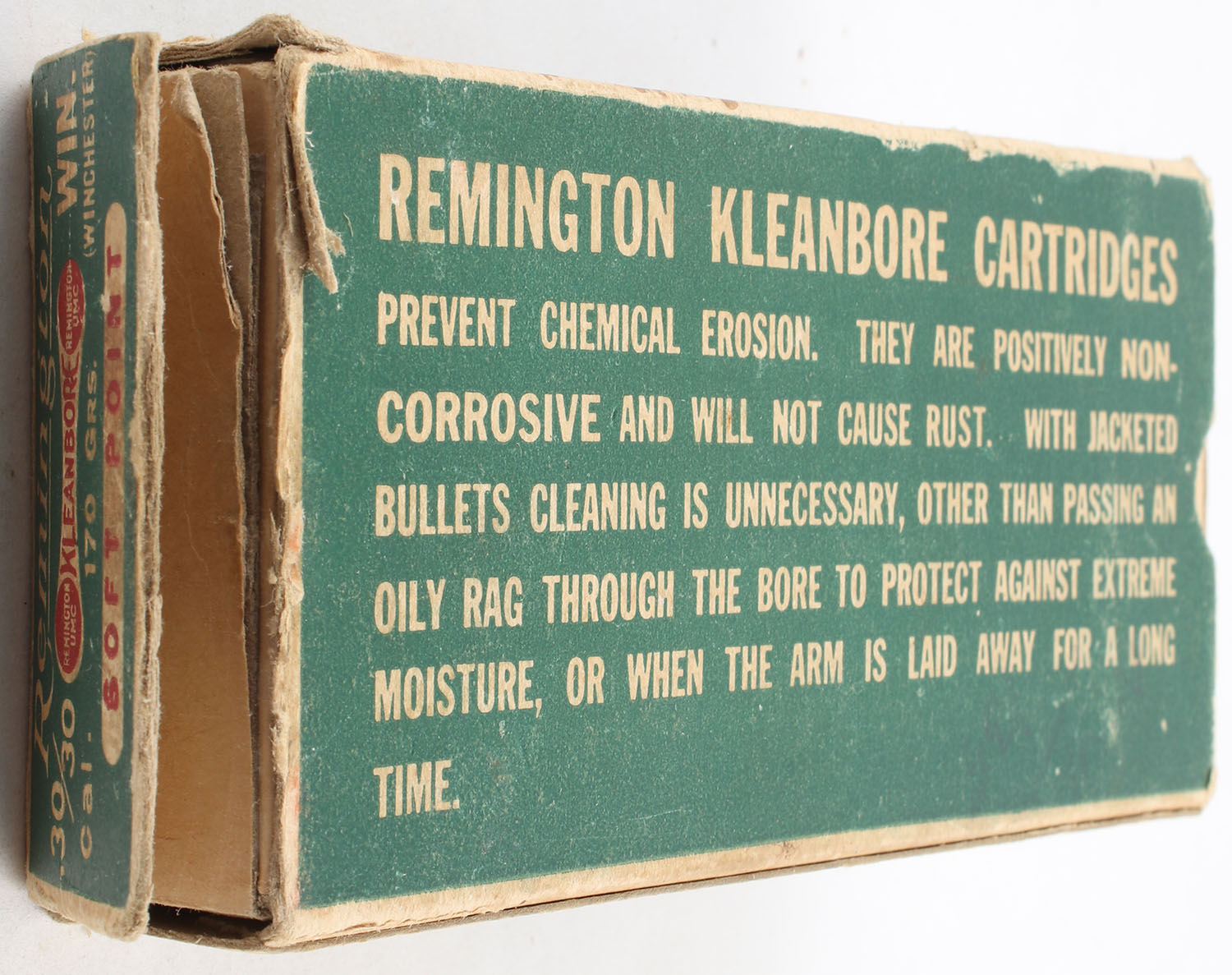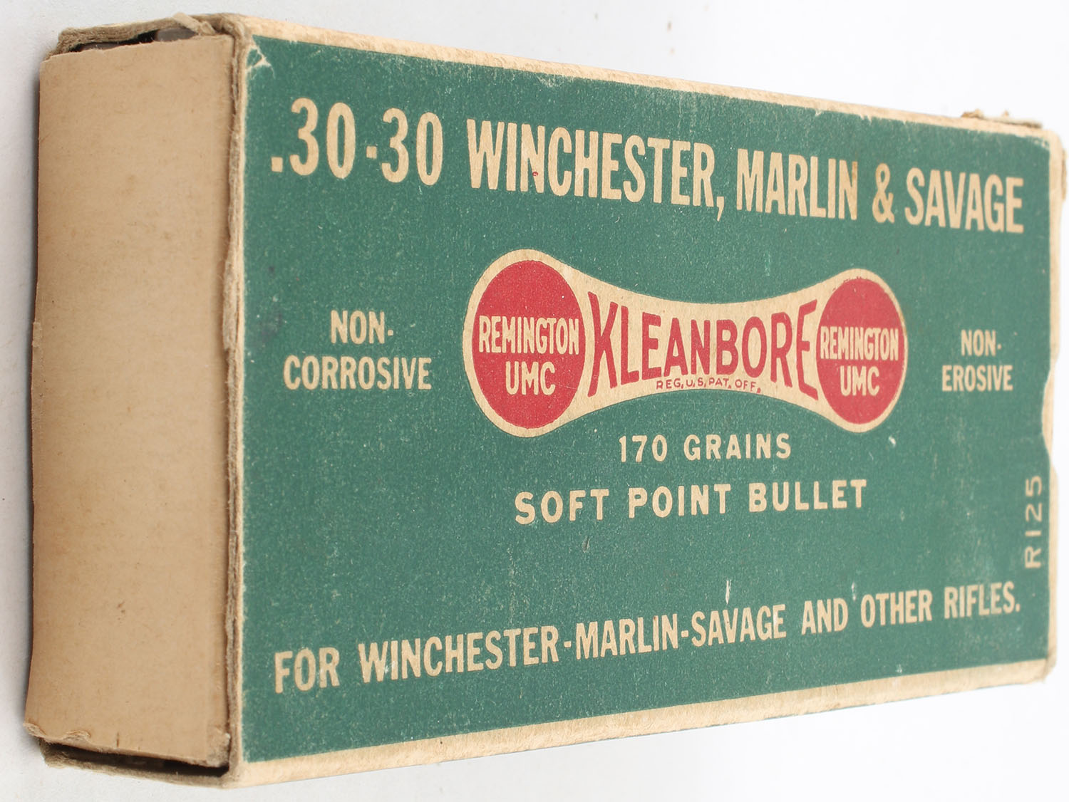 Remington, Kleanbore, .30-30 Winchester, Marlin & Savage, 170 Grain Soft Point Bullet, Full of wrong ammo, 1pc. Green buff & red dogbone box, box has a missing left end flap, torn right end flap, light edge & corner wear, ammo is excellent. Grade: Good ++ - Value: 10 to 40