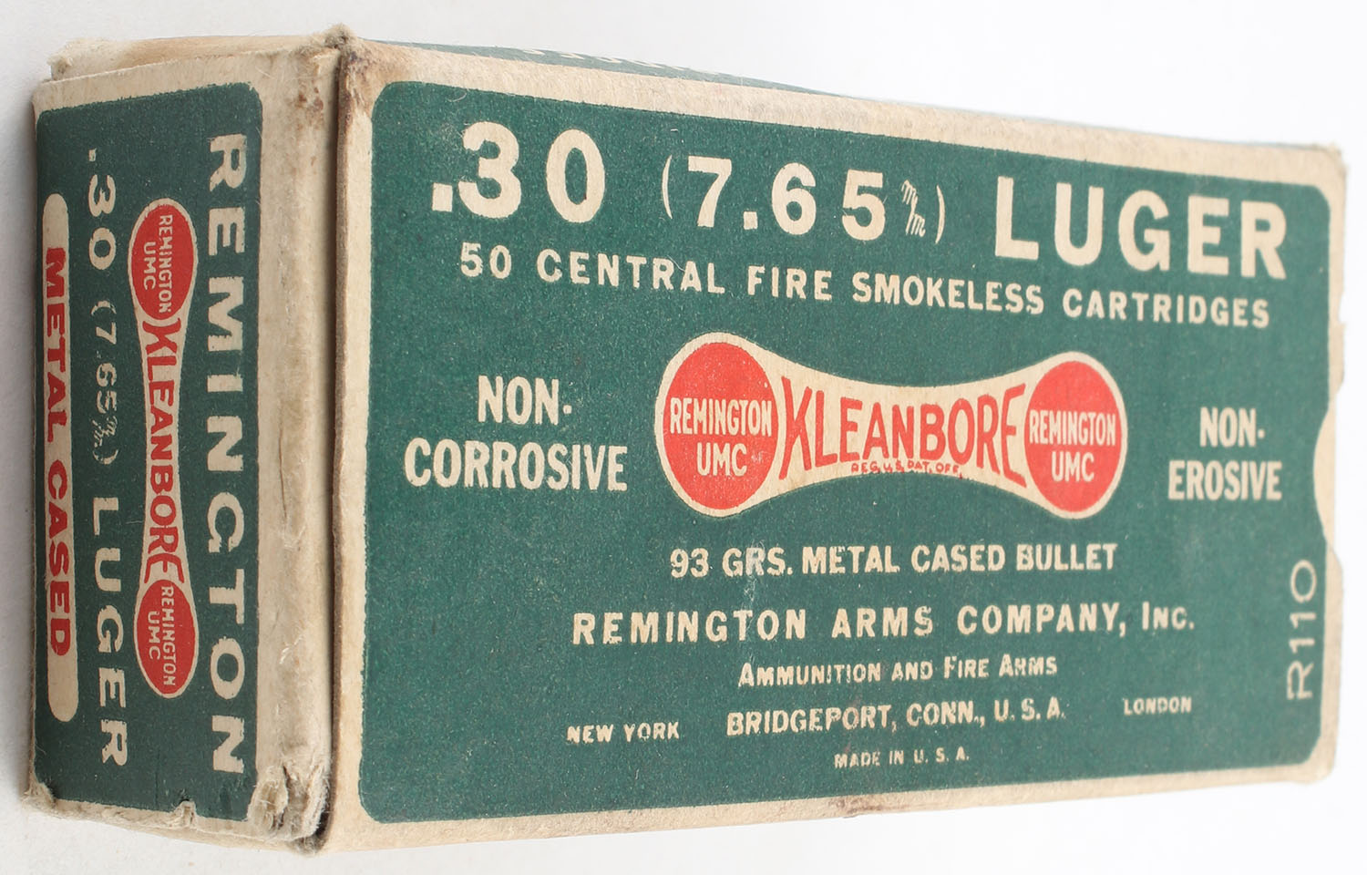 Remington, Kleanbore, .30 (7.65) LUGER, 93 Grain Metal Cased Bullet, Full, 1pc. Green buff & red dog bone box, box is very solid with excellent color, light edge & corner wear, light scuffing, end flaps are solid, ammo is excellent. Grade: Very Good ++ - Value: 20 to 60