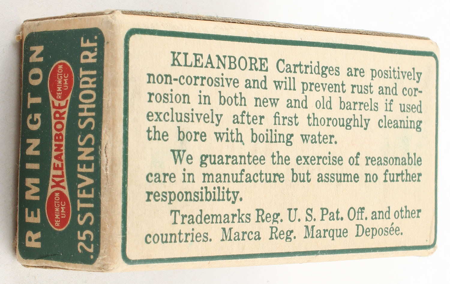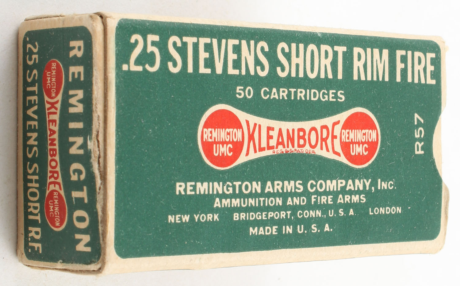 Remington, Kleanbore, .25 Stevens Short Rim Fire, Full, 1pc. Green buff & red dog bone box, box is very solid with excellent color, end flaps are solid, ammo is excellent. Grade: Excellent ++ - Value: 50 to 100