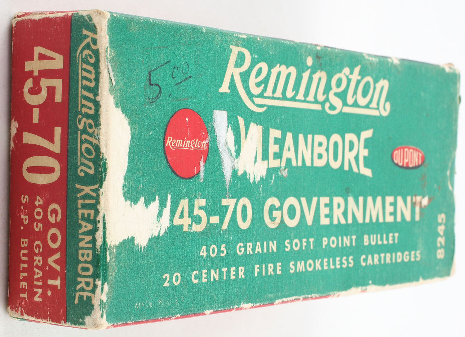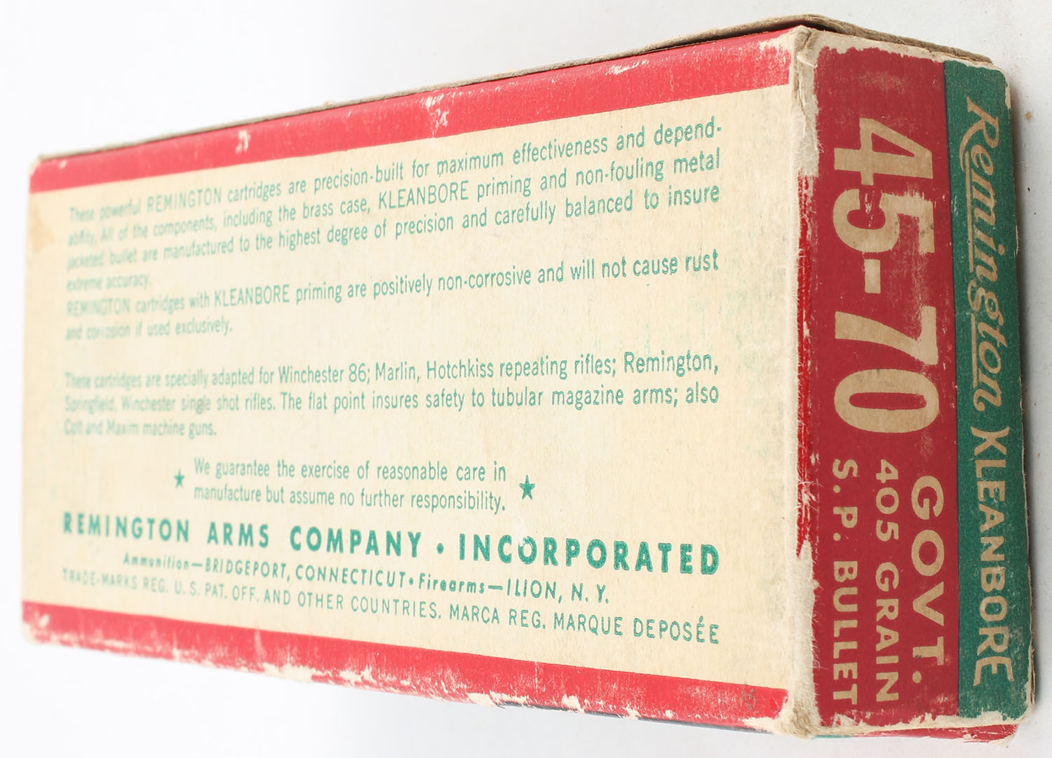 Remington, Kleanbore, .45-70 Government, 405 Grain Soft Point Bullet, Full, 1pc. Green red & buff box, box has edge & corner wear, small tear to front, end flaps are solid, ammo is excellent. Grade: Very Good ++ - Value: 20 to 60