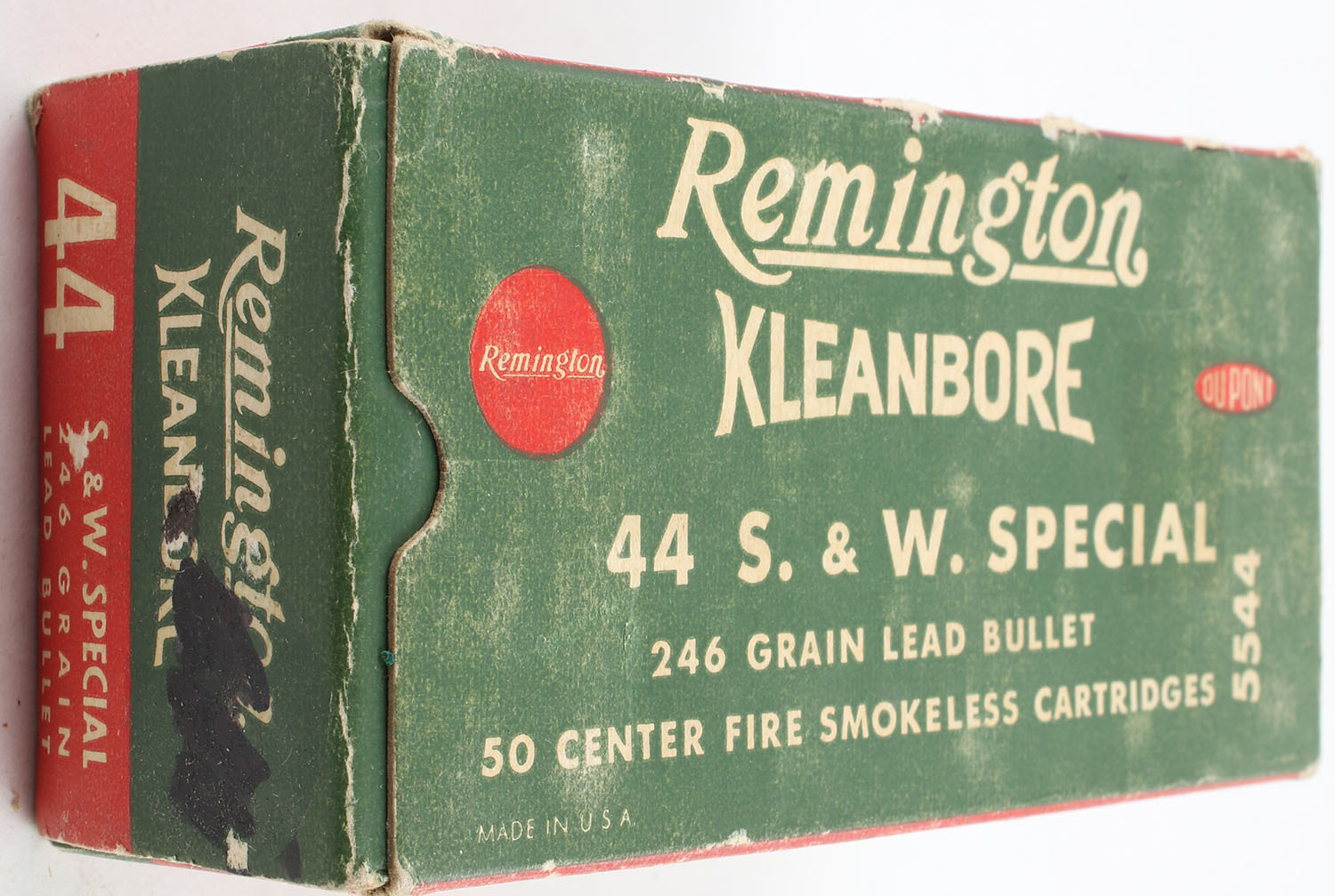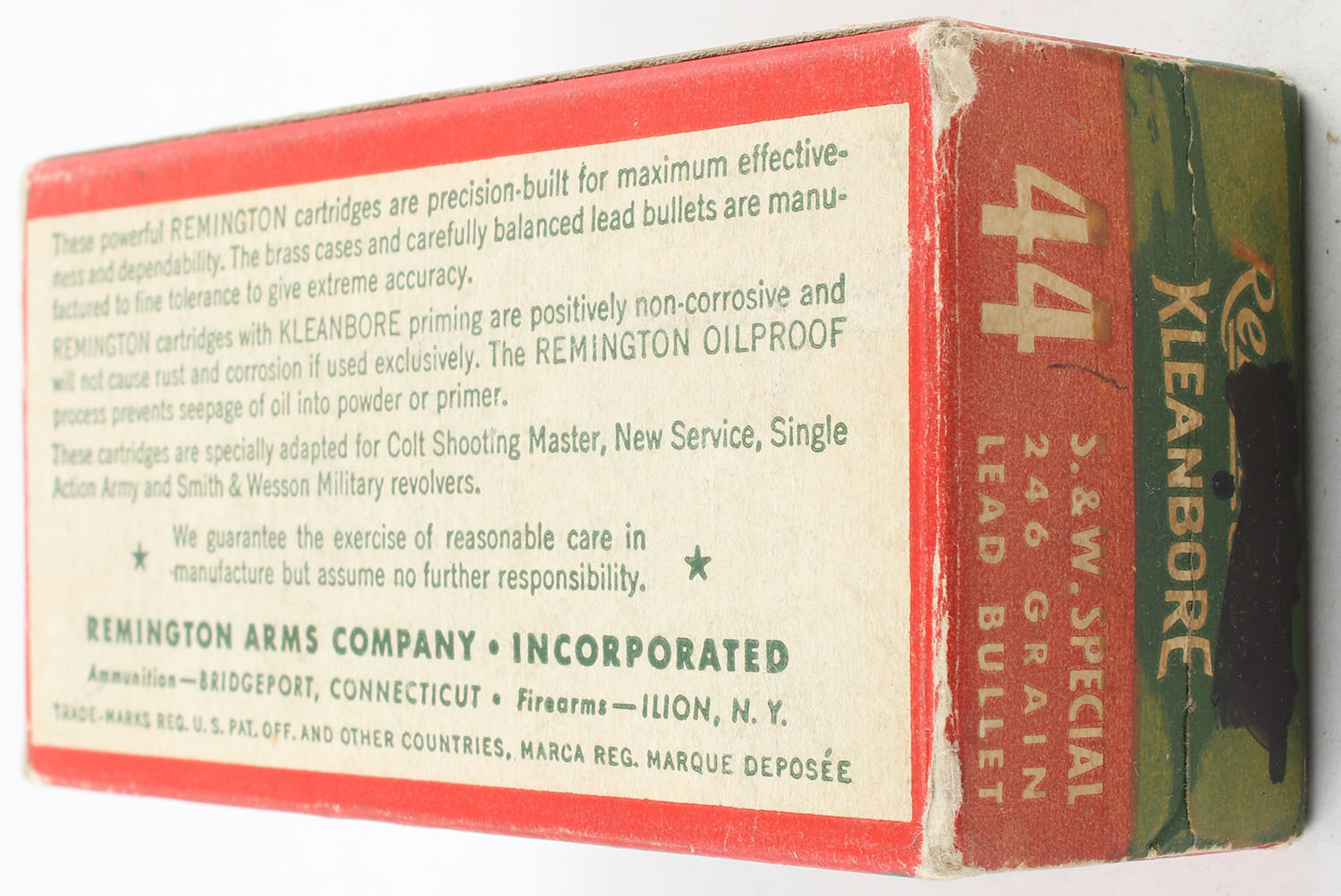 Remington, Kleanbore, .44 Smith & Wesson Special, 246 Gran Lead Bullet, Full, 1pc. Green red & white box, box is solid with good color, has light age soiling, edge & corner wear, end flaps are solid, ammo is excellent. Grade: Very Good ++ - Value: 40 to 80