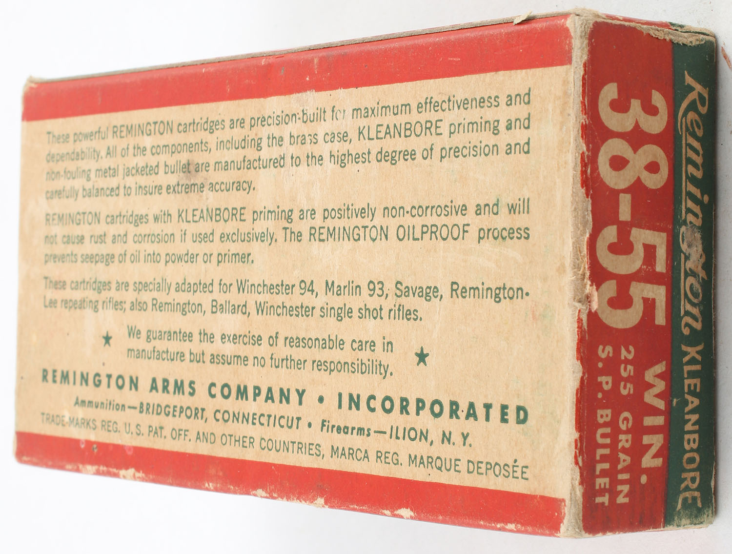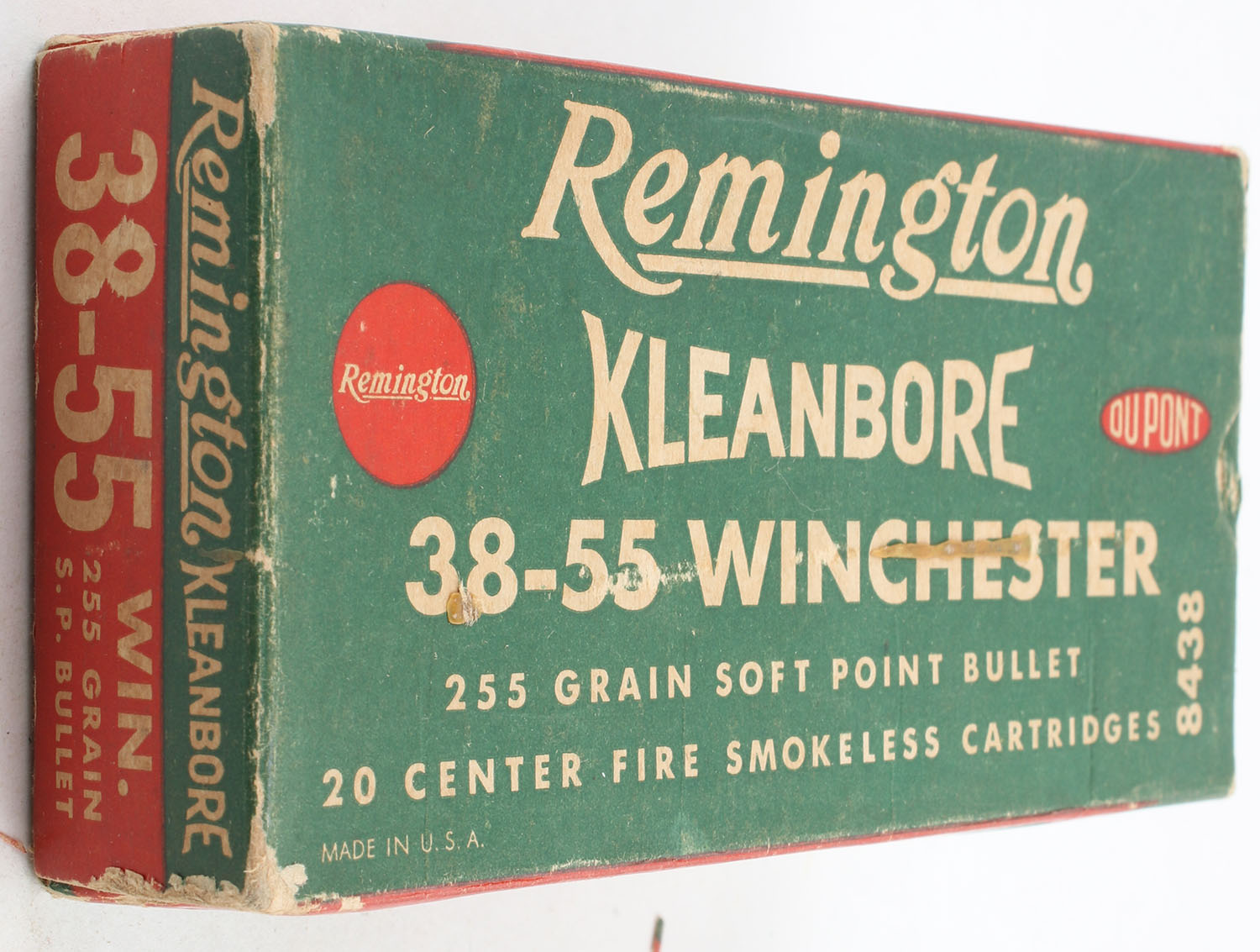 Remington, Kleanbore, .38-55 Winchester, 255 Grain Soft Point Bullet, Full, 1pc. Green white & red box, box is solid with very good color, minor age soiling & shelf wear, some corner wear, edge wear, end flaps are solid, ammo is excellent. Grade: Very Good ++ - Value: 30 to 90