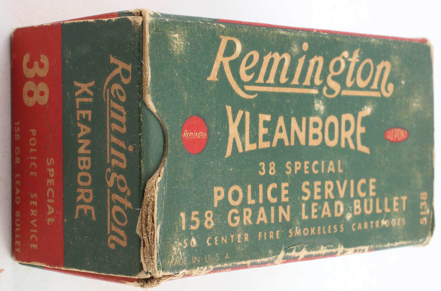 Remington, Kleanbore Police Service, .38 Special, 158 Grain Lead Bullet, Full, 1pc. Green buff & red box, box is solid with very good color, some color fading & scuffing, edge & corner wear, end flaps are solid, ammo is excellent. Grade: Very Good ++ - Value: 20 to 30