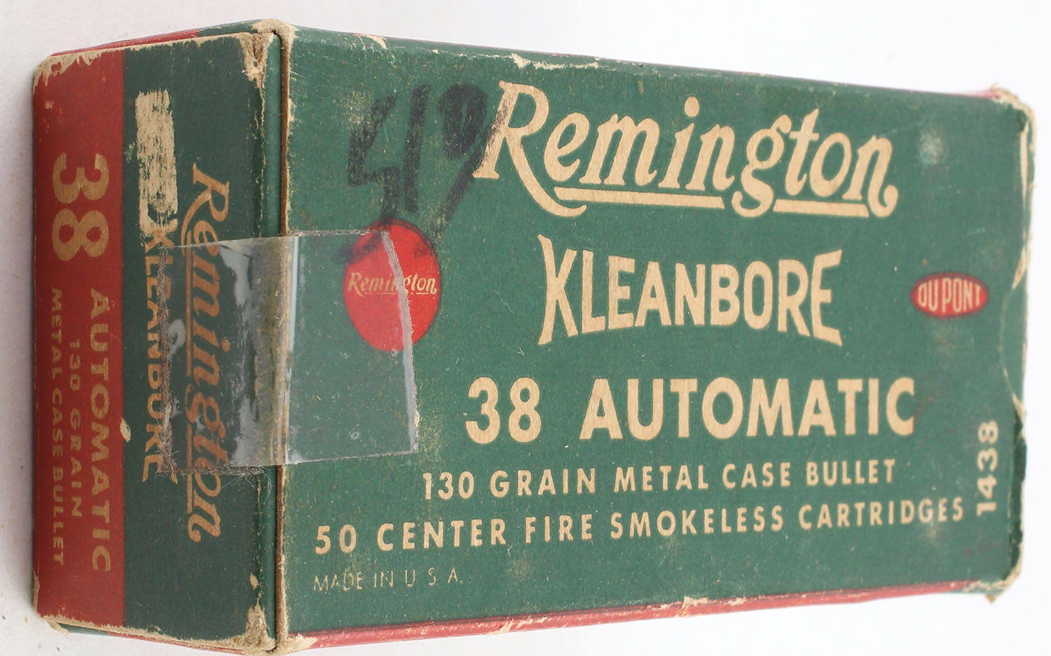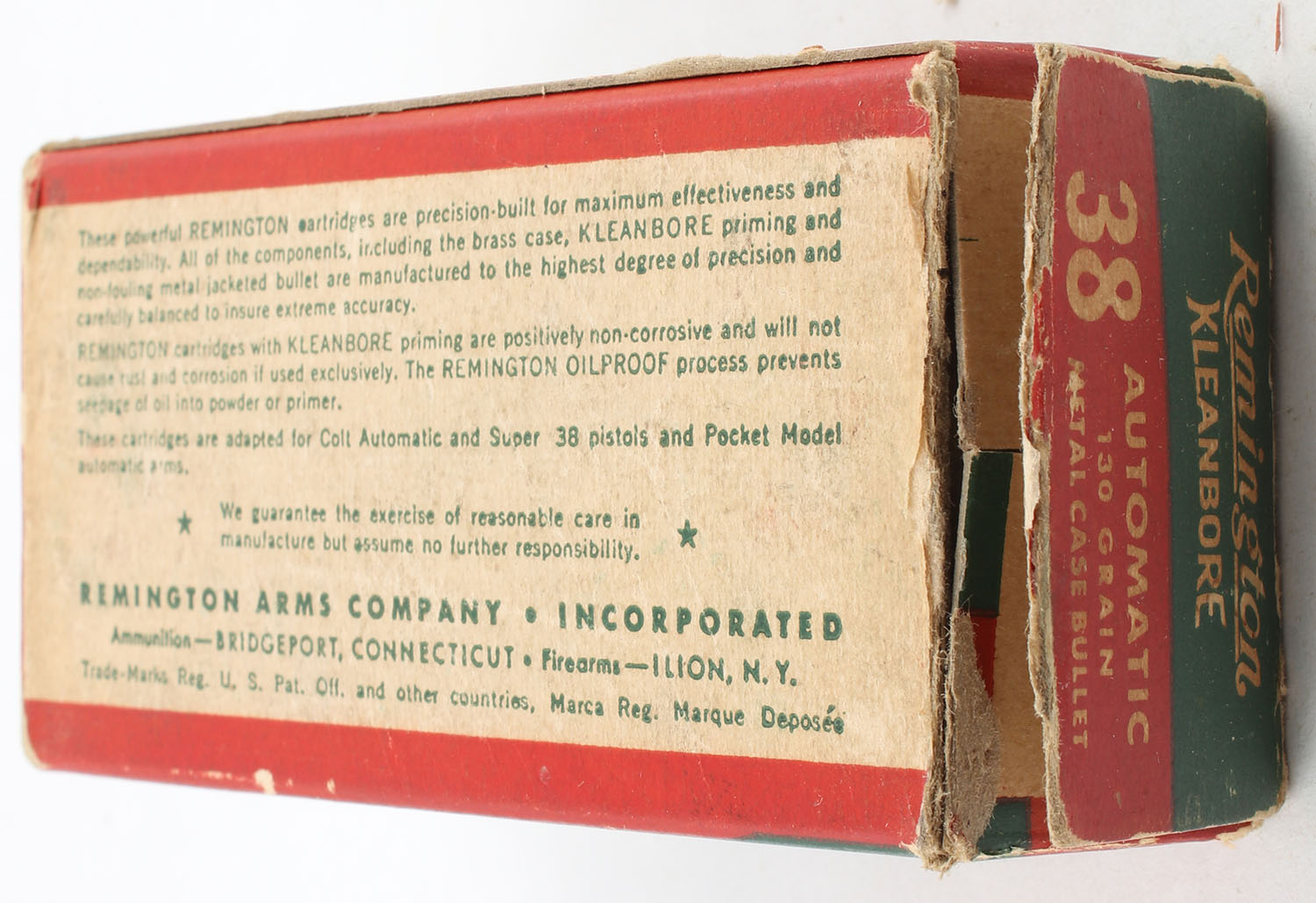 Remington, Kleanbore, .38 Automatic, 130 Grain Metal Case Bullet, Full 1pc. Green white & red box, box is solid with good color, has edge & corner wear, minor age soiling, right end flap is torn, left end flap is solid, ammo is excellent. Grade: Very Good + - Value: 10 to 40