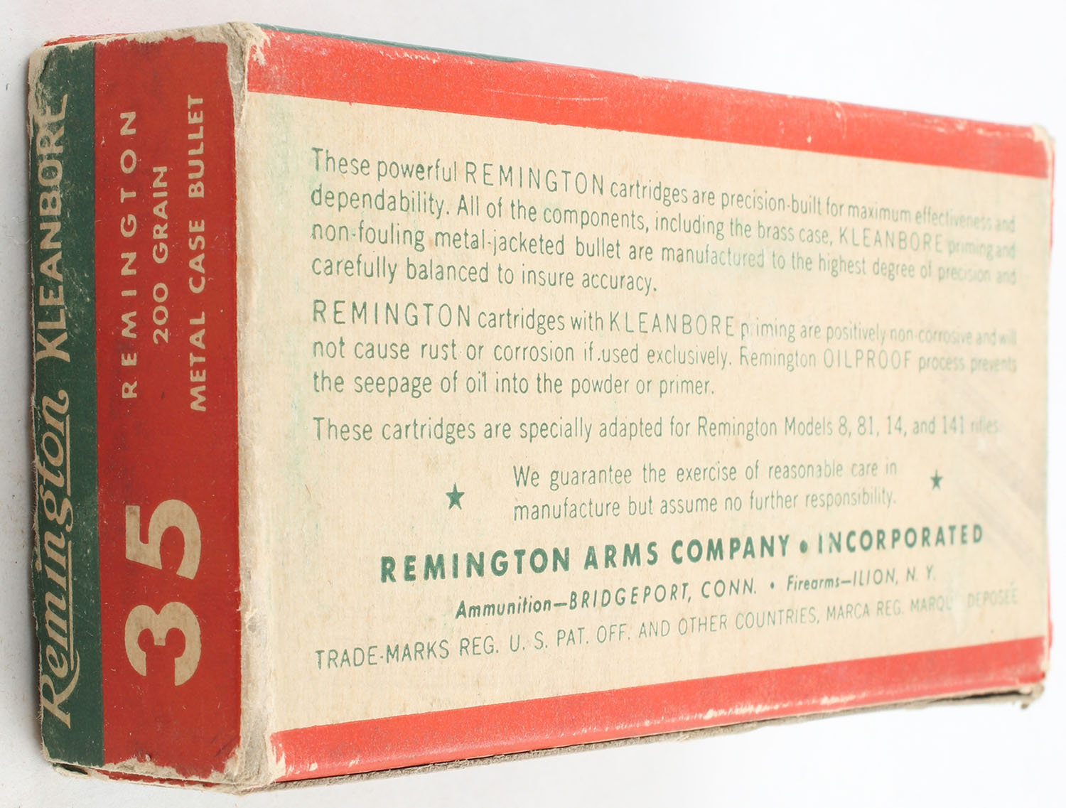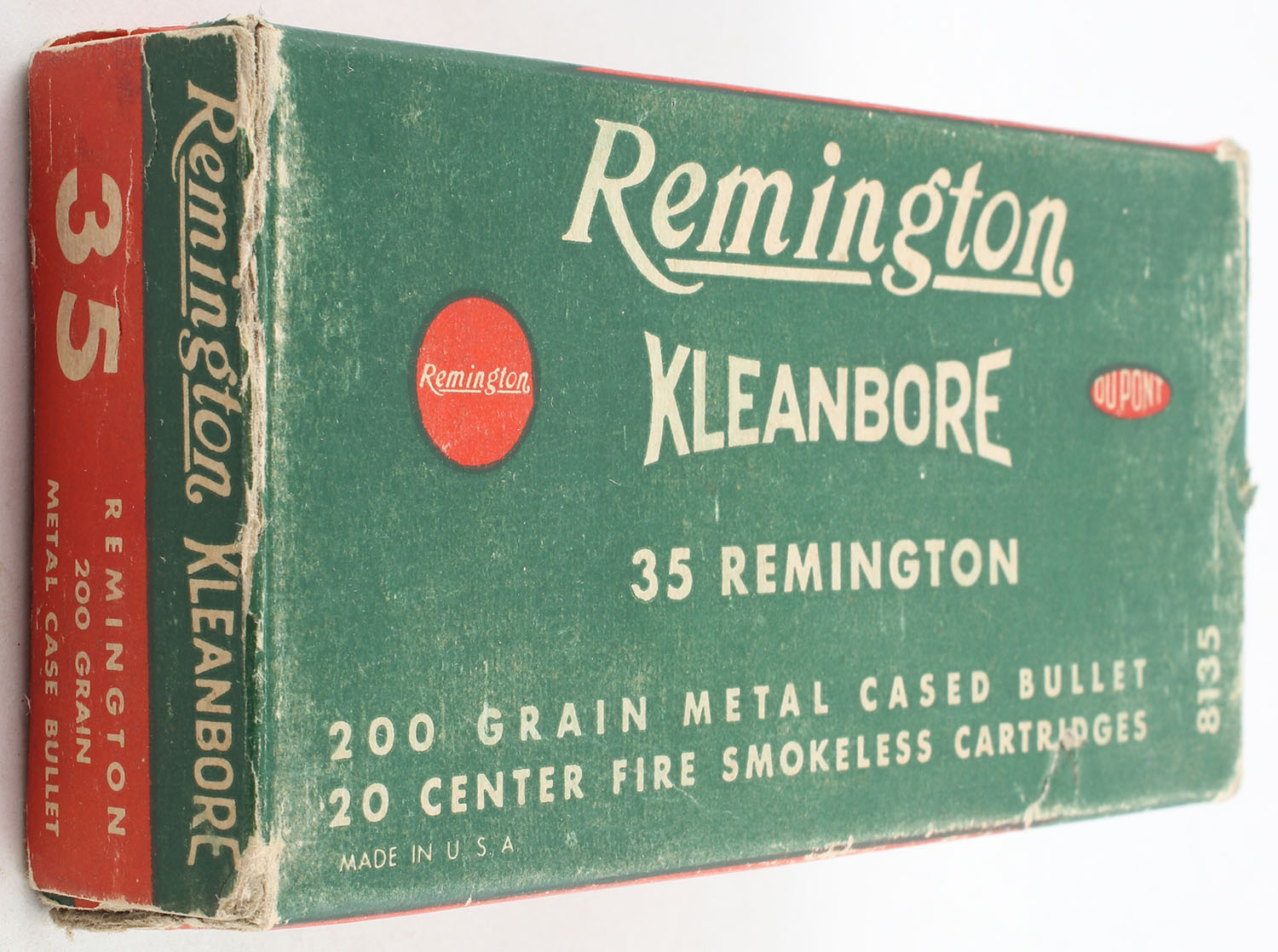 Remington, Kleanbore, .35 Remington, 200 Grain Metal Cased Bullet, Full, 1pc. Green buff & red box, box is solid with very good color, minor age soiling, some shelf wear, edge & corner wear, end flaps are solid, ammo is excellent. Grade: Very Good ++ - Value: 40 to 60