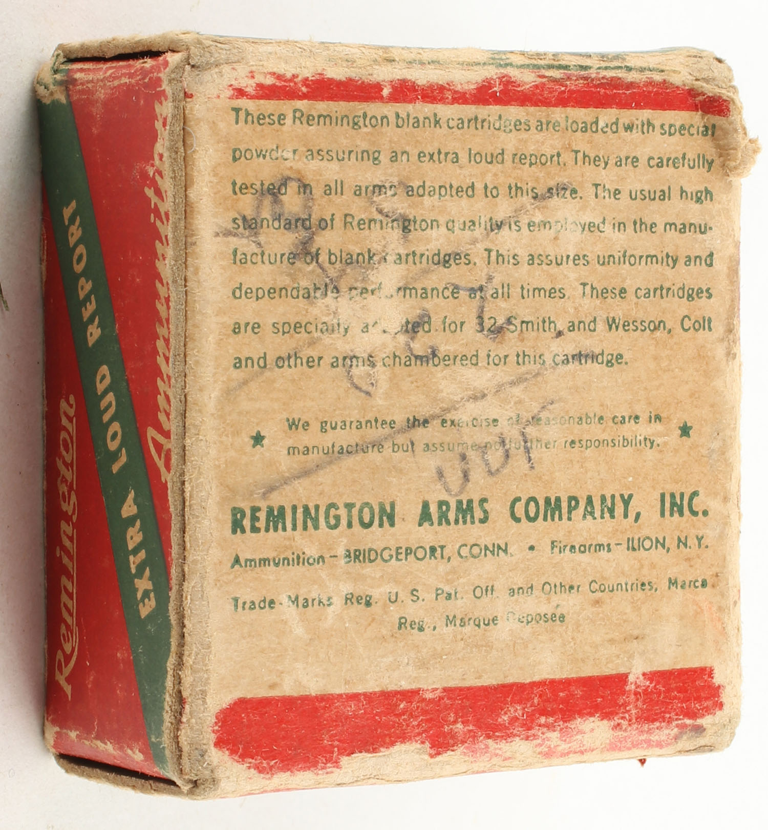 Remington, .32 Smith & Wesson BLANKS, Partial 47rds., 1pc. Green white & red box, box has age soiling, edge & corner wear, scuffing, end flaps are solid, ammo is excellent. Grade: Good ++ - Value: 8 to 20