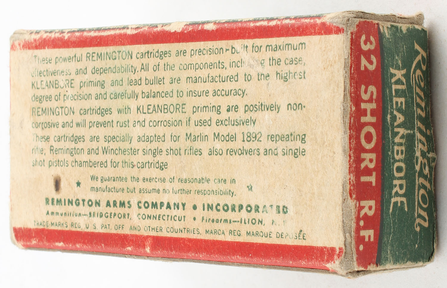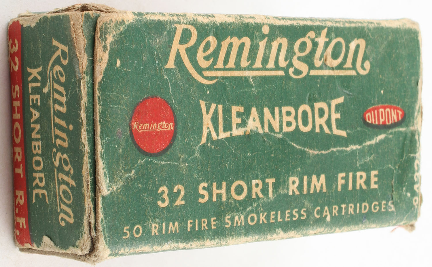 Remington, Kleanbore, .32 Short Rim Fire, Smokeless, Full, 1pc. Green white & red box, box is solid with good color, has light age soiling with scuffing, edge & corner wear, end flaps are solid, ammo is good. Grade: Very Good - Value: 50 to 150