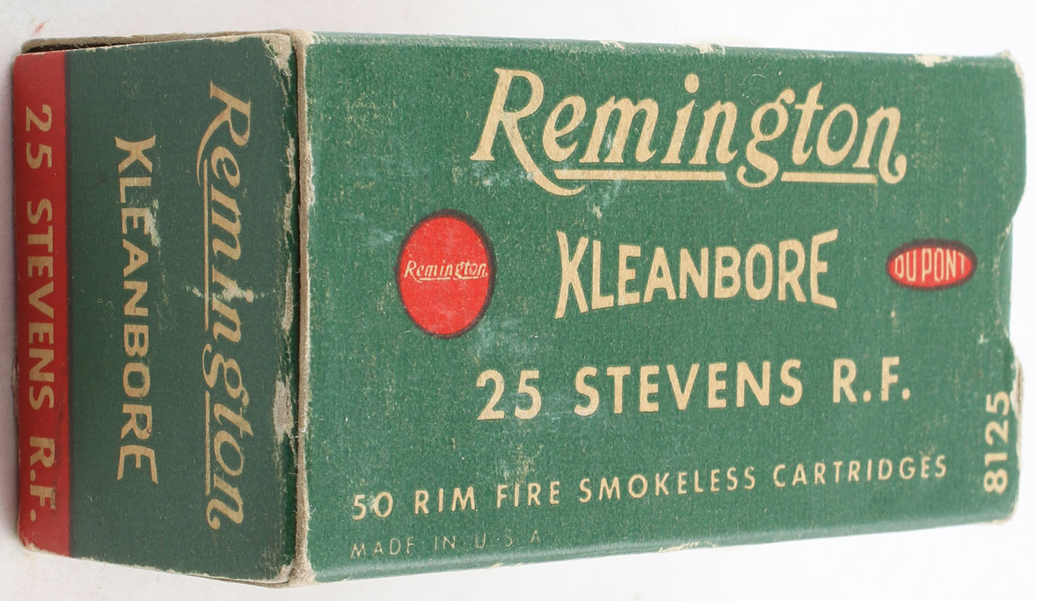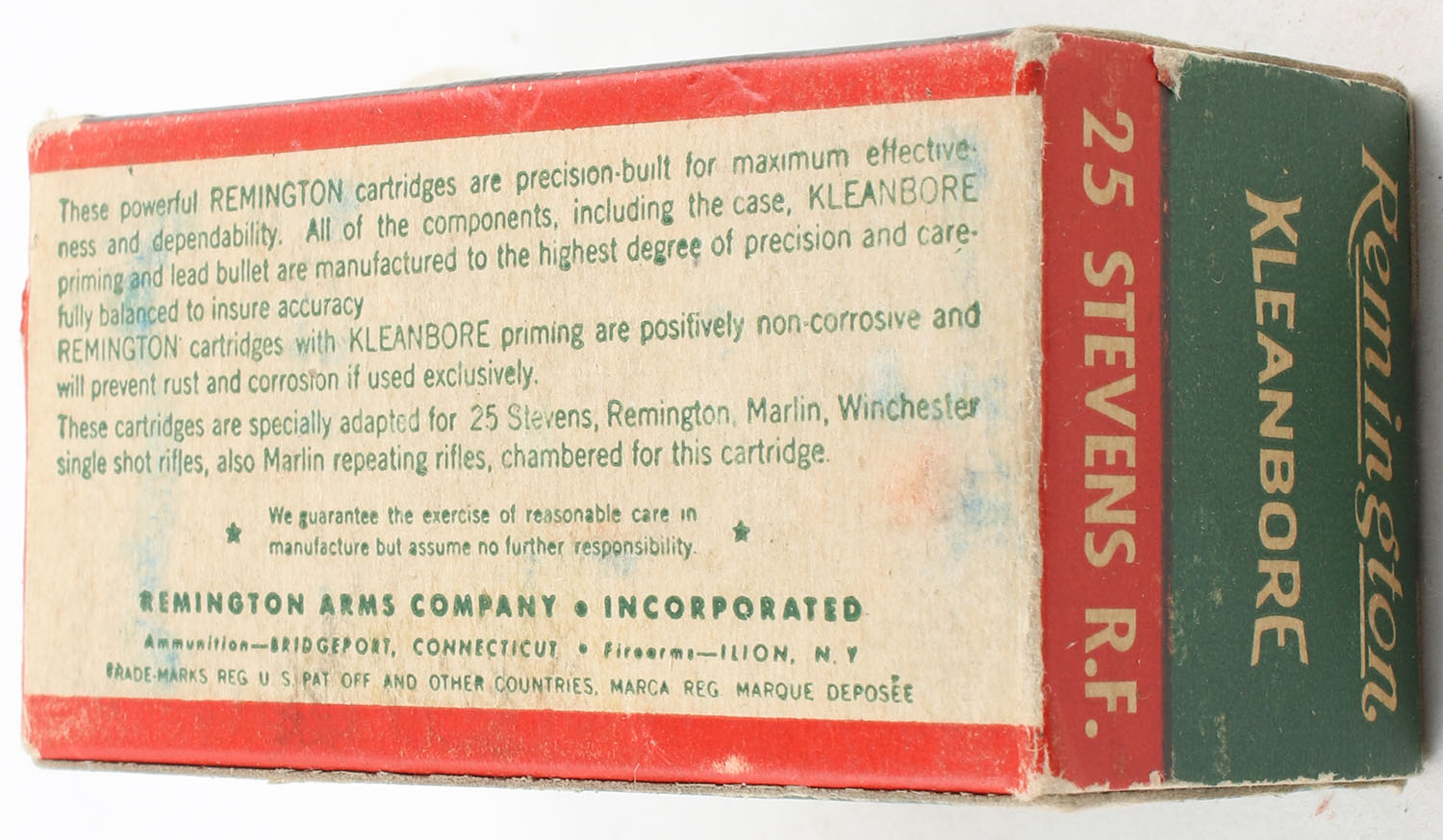 Remington, Kleanbore, .25 Stevens Rim Fire, Smokeless, Full, 1pc. Green white & red box, box has light edge & corner wear with very good color, ammo is excellent, end flaps are solid. Grade: Excellent - Value: 50 to 150