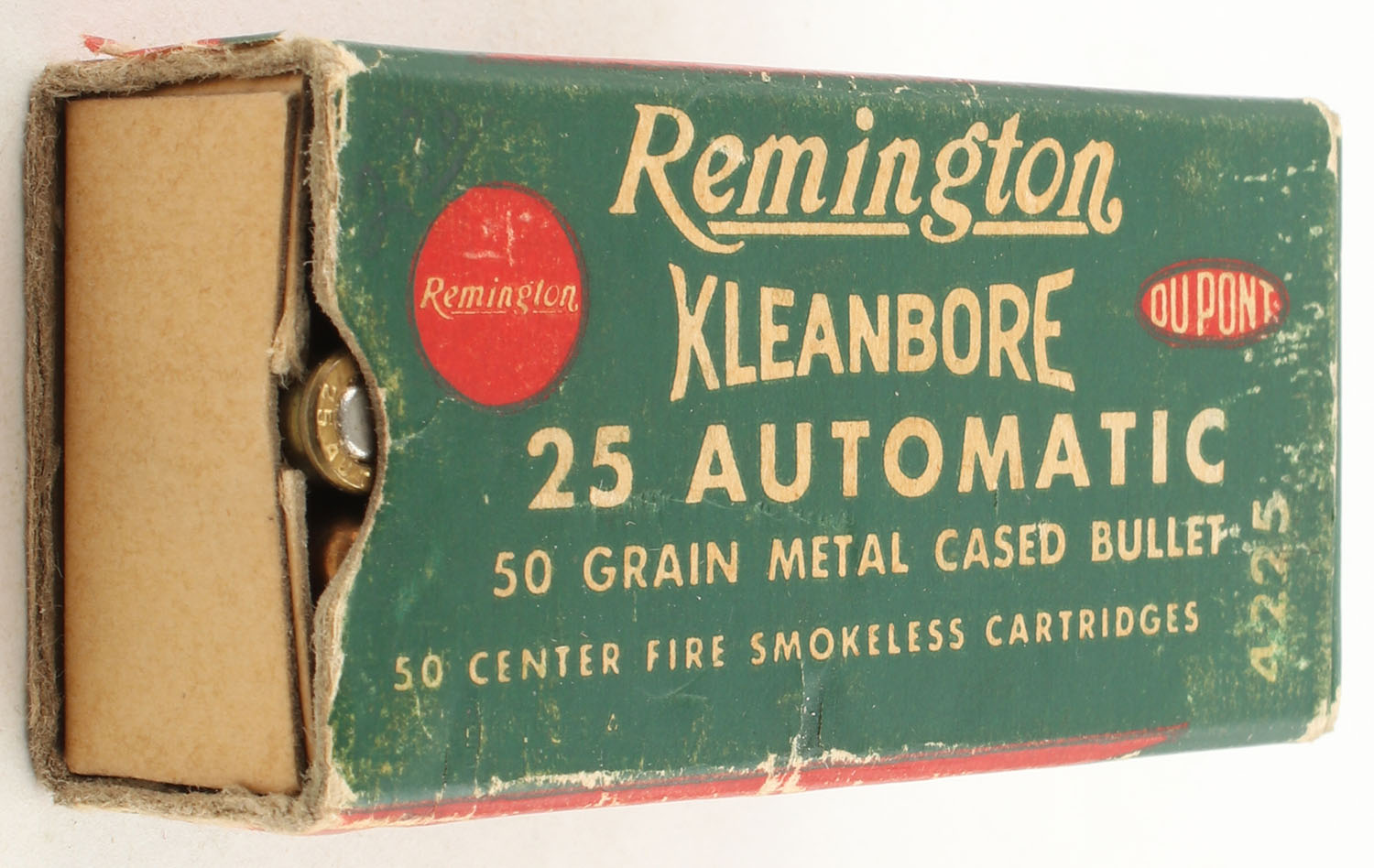 Remington, Kleanbore, .25 Automatic, 50 Grain Metal Cased Bullet, Partial 40rds., 1pc. Green buff & red box, box is solid with very good color, box is missing left end flap, light edge & corner wear, right flap is solid, ammo is excellent. Grade: Good ++ - Value: 10 to 20