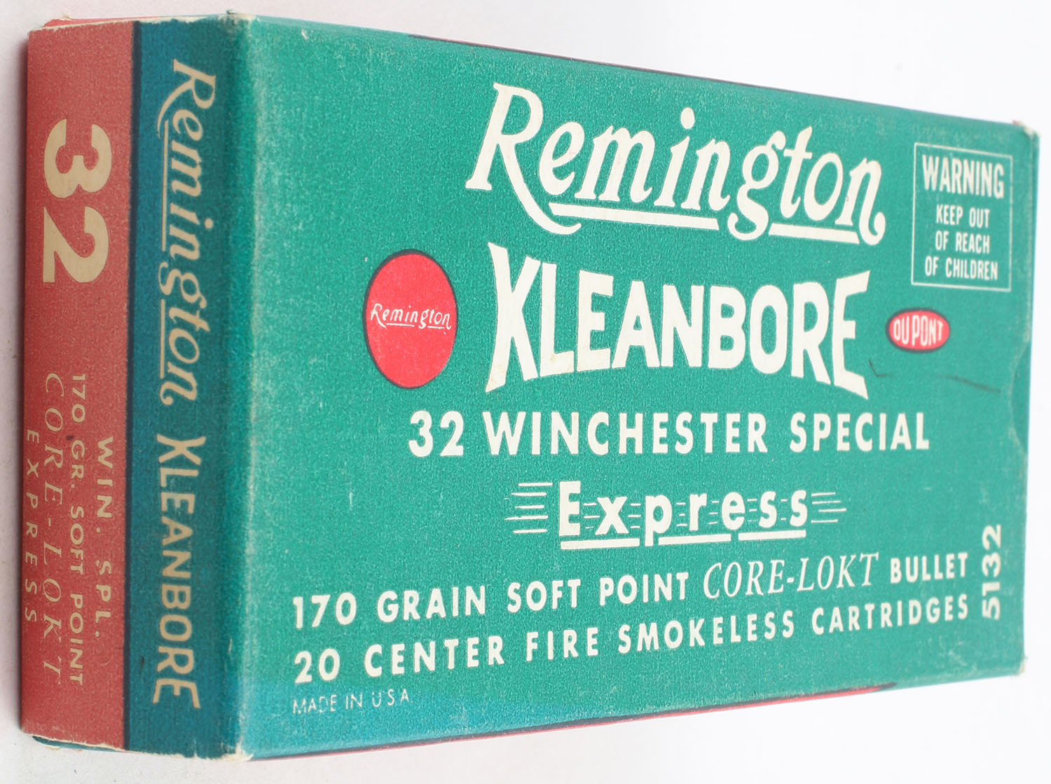 Remington, Kleanbore Express, .32 Winchester Special, 170 Grain Soft Point Core-Lokt Bullet, Full, 1pc. Green buff & red box, box is very solid with excellent color, has shelf wear, end flaps are solid, ammo is excellent. Grade: Excellent ++ - Value: 20 to 60