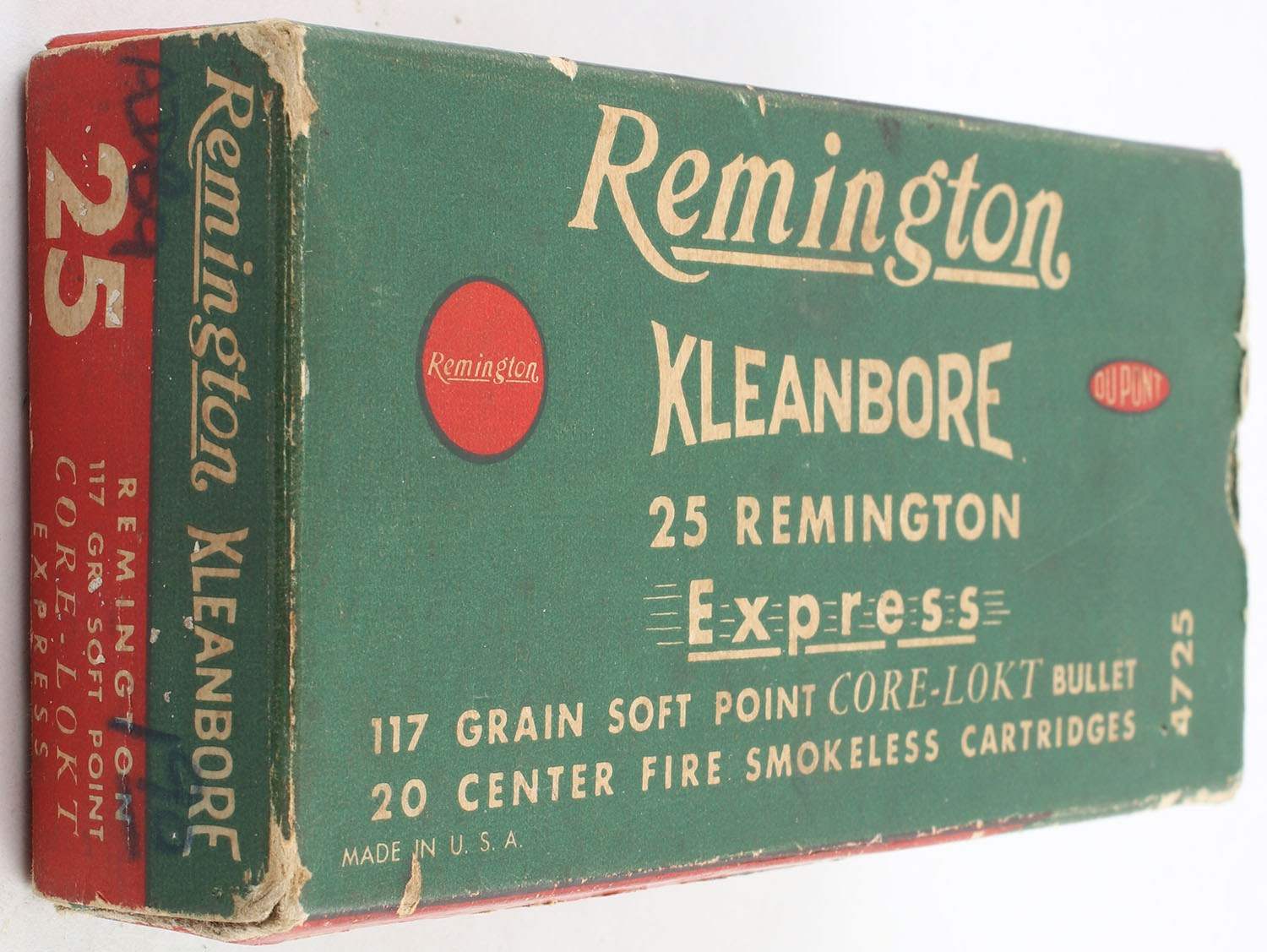 Remington, Kleanbore Express, .25 Remington, 117 Grain Soft Point, Full, 1pc. Green white & red box, box is solid with good color, edge & corner wear, scuffing to bottom, end flaps are solid, ammo is excellent. Grade: Very Good ++ - Value: 20 to 60