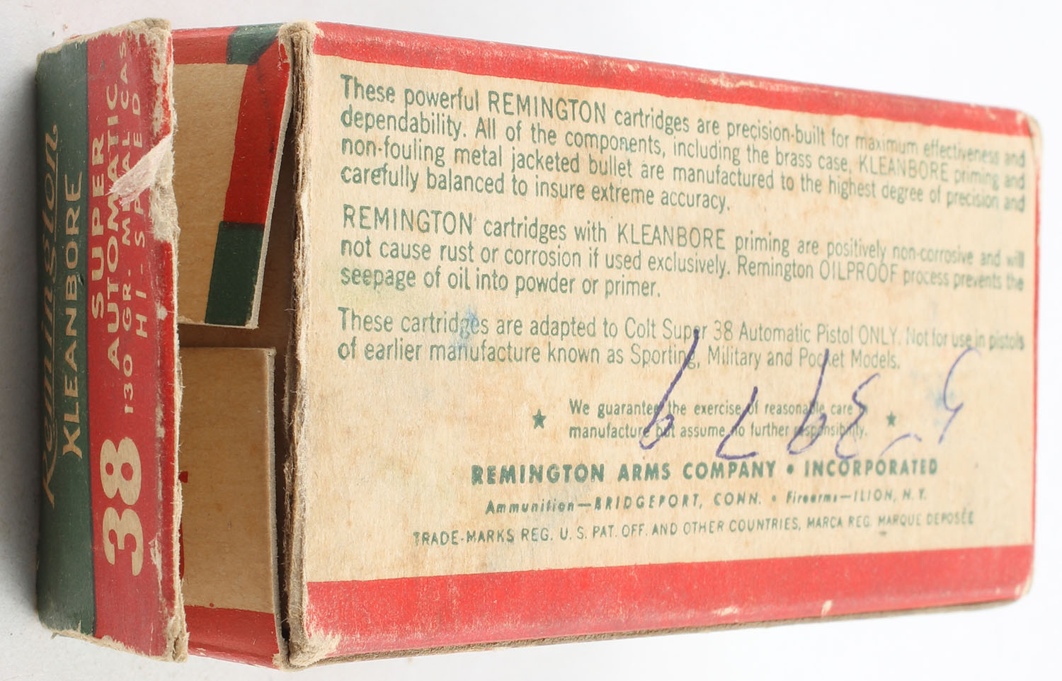 Remington, Kleanbore, .38 Super Automatic, 130 Grain Metal Case Bullet, Hi-Speed, Full, 1pc. Green white & red box, box is solid, has edge & corner wear, light scuffing, right end flap is torn, left flap is solid, ammo is excellent. Grade: Very Good - Value: 20 to 60