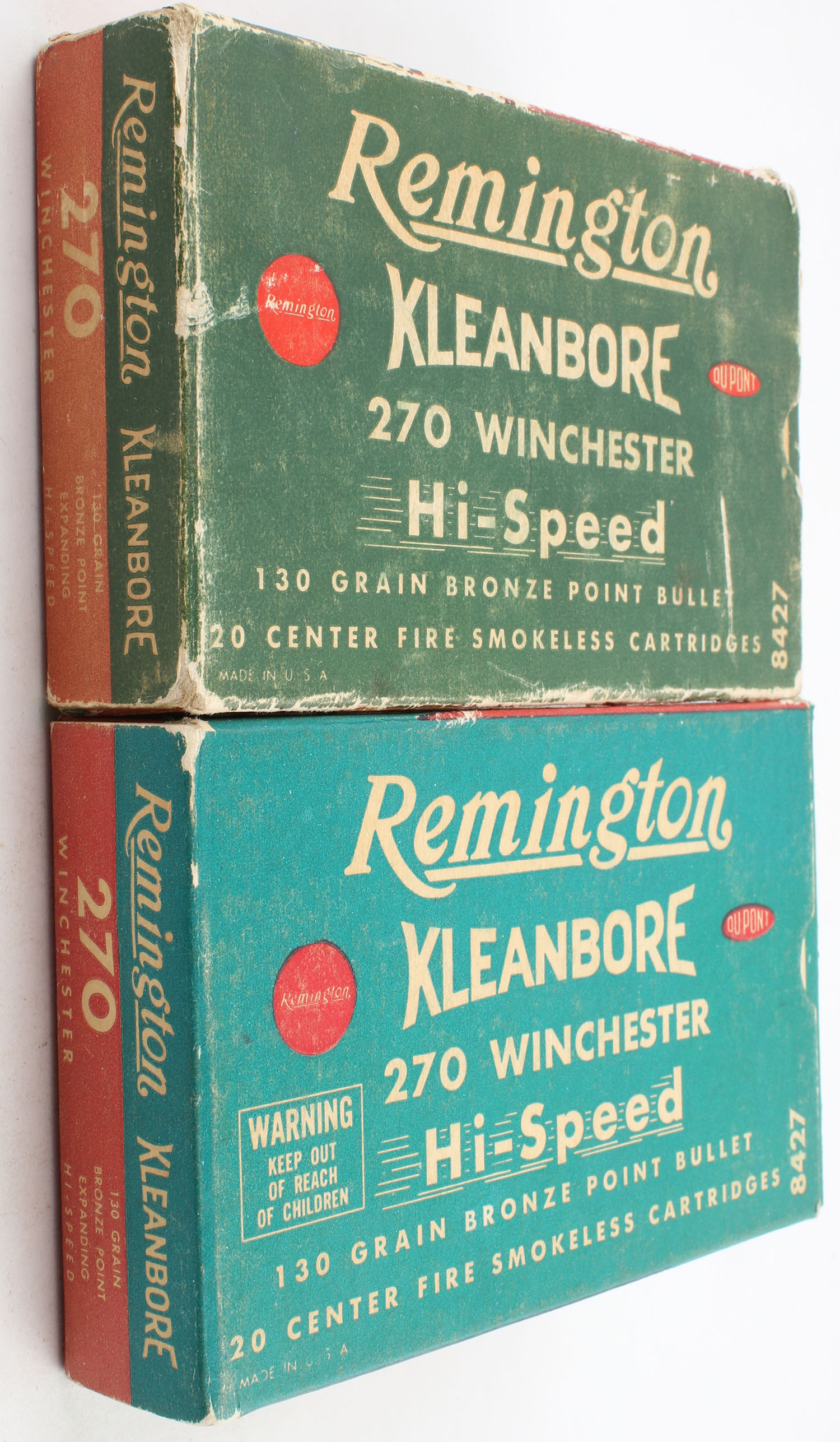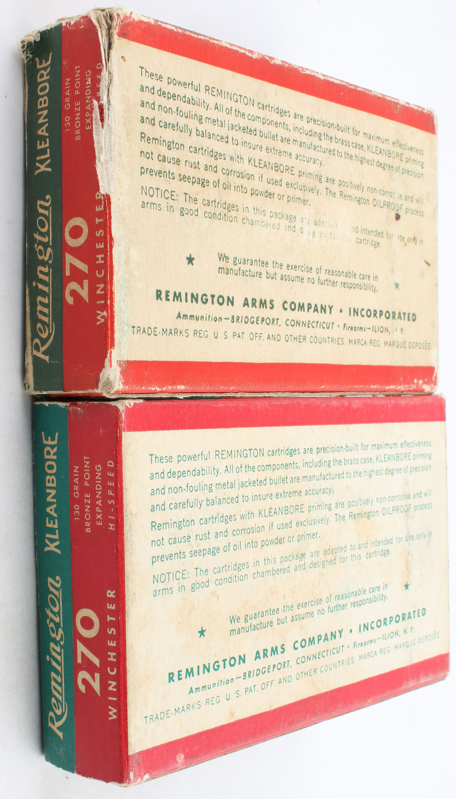 Remington, Lot of (2), Kleanbore Hi Speed, 130 Grain Bronze Point Bullet, (1) box is Full, (1) box is Partial 10rds., 1pc. Green white & red boxes, boxes have age soiling, edge & corner wear, end flaps are solid, ammo is very good. Grade: Very Good - Value: 30 to 50