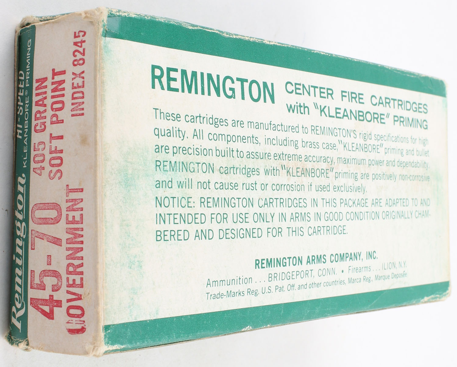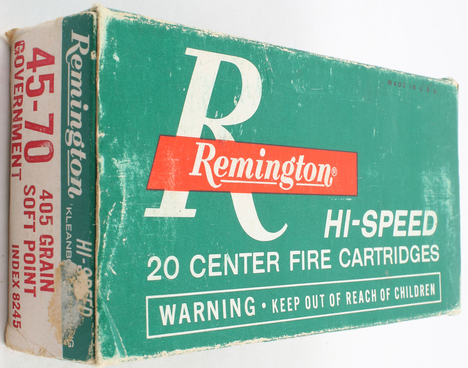 Remington, Hi-Speed, .45-70 Government, 405 Grain Soft Point, Full, 1pc. Green white & red box, box is solid with good color, has edge & corner wear, scuffing, shelf wear, end flaps are solid ammo is excellent. Grade: Very Good ++ - Value: 20 to 60
