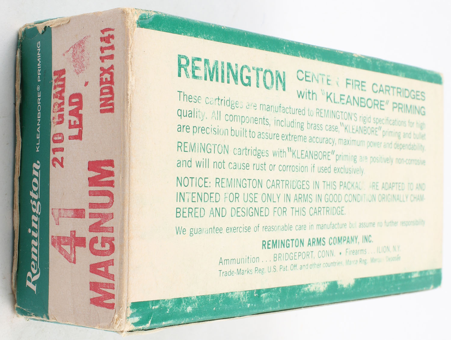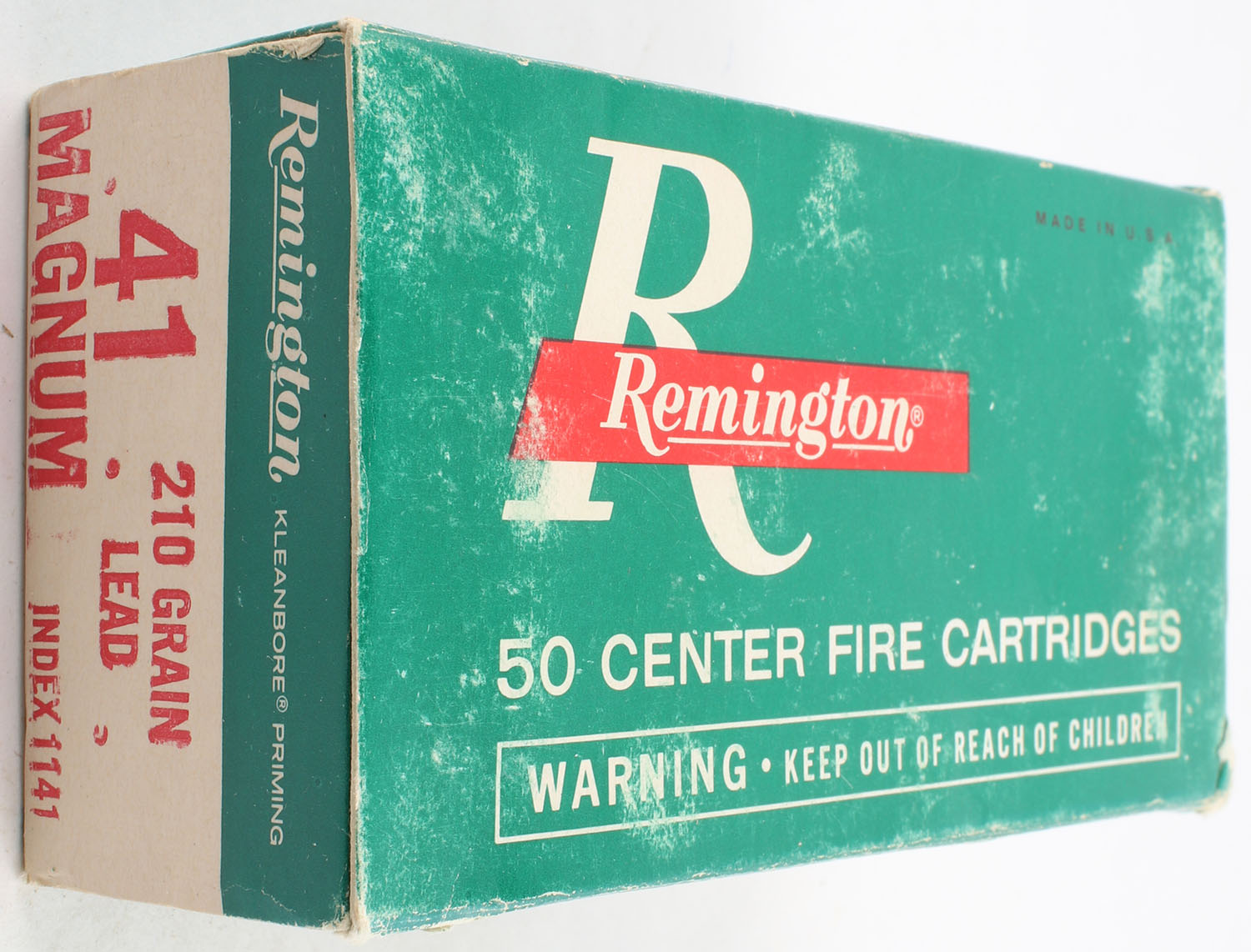Remington, Center Fire Cartridges, .41 Magnum, 210 Grain Lead, Partial 44rds., 1pc. Green white & red box, box is solid with excellent color, has light edge & corner wear, light scuffing, end flaps are solid, ammo is excellent. Grade: Very Good + - Value: 40 to 80