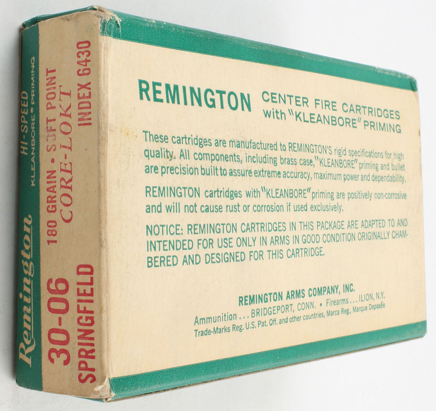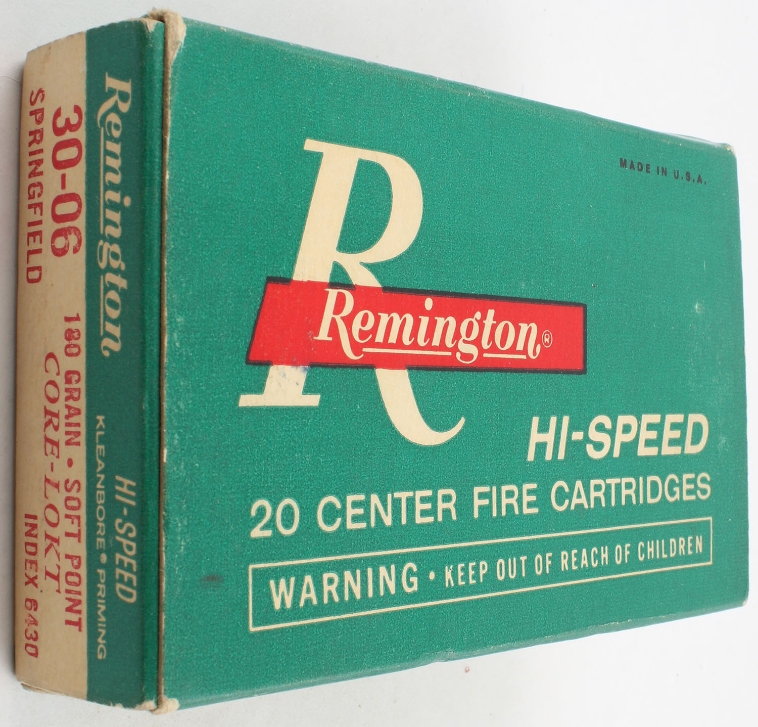 Remington, Hi-Speed, .30-06 Springfield, 180 Grain Soft Point Core Lokt, Full with 18rds. Being correct, 1pc. Green white & red box, box is very solid with excellent color, has minor shelf wear, light corner wear, end flaps are solid, ammo is excellent. Grade: Excellent - Value: 16 to 30
