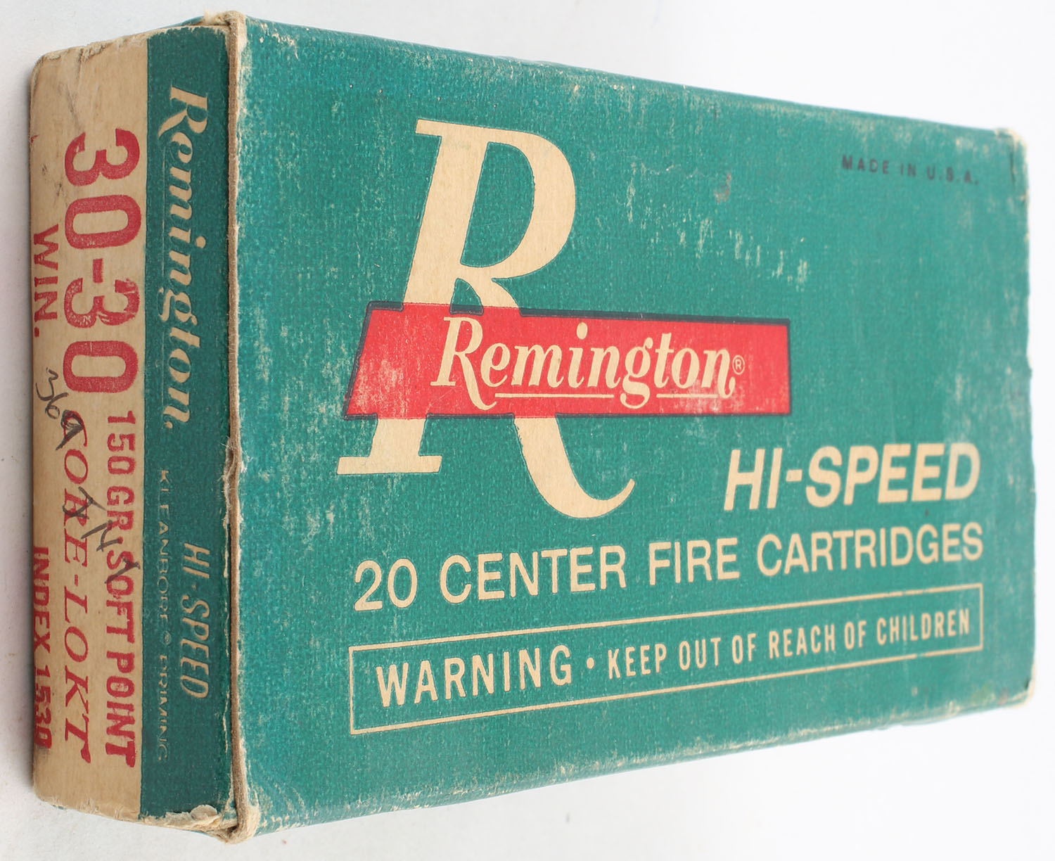 Remington, Hi-Speed, .30-30 Winchester, 150 Grain Soft Point, Core Lokt, Full of mixed ammo, 1pc. Green white & red box, box is solid with good color, has light age soiling, edge & corner wear, end flaps are solid, ammo is very good. Grade: Very Good - Value: 8 to 30