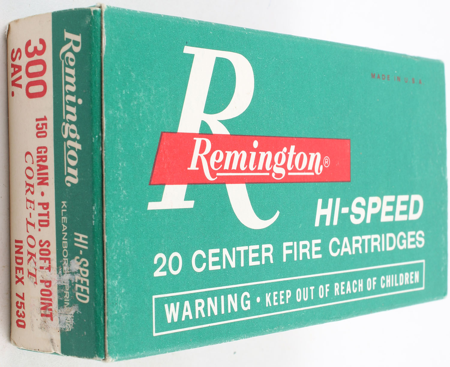 Remington, Hi-Speed, .300 Savage, 150 Grain PTD. Soft Point Core-Lokt, Full, 1pc, Green white & red box, box is very solid with excellent color, very minor shelf wear, end flaps are solid, ammo is excellent. Grade: Excellent + - Value: 20 to 60