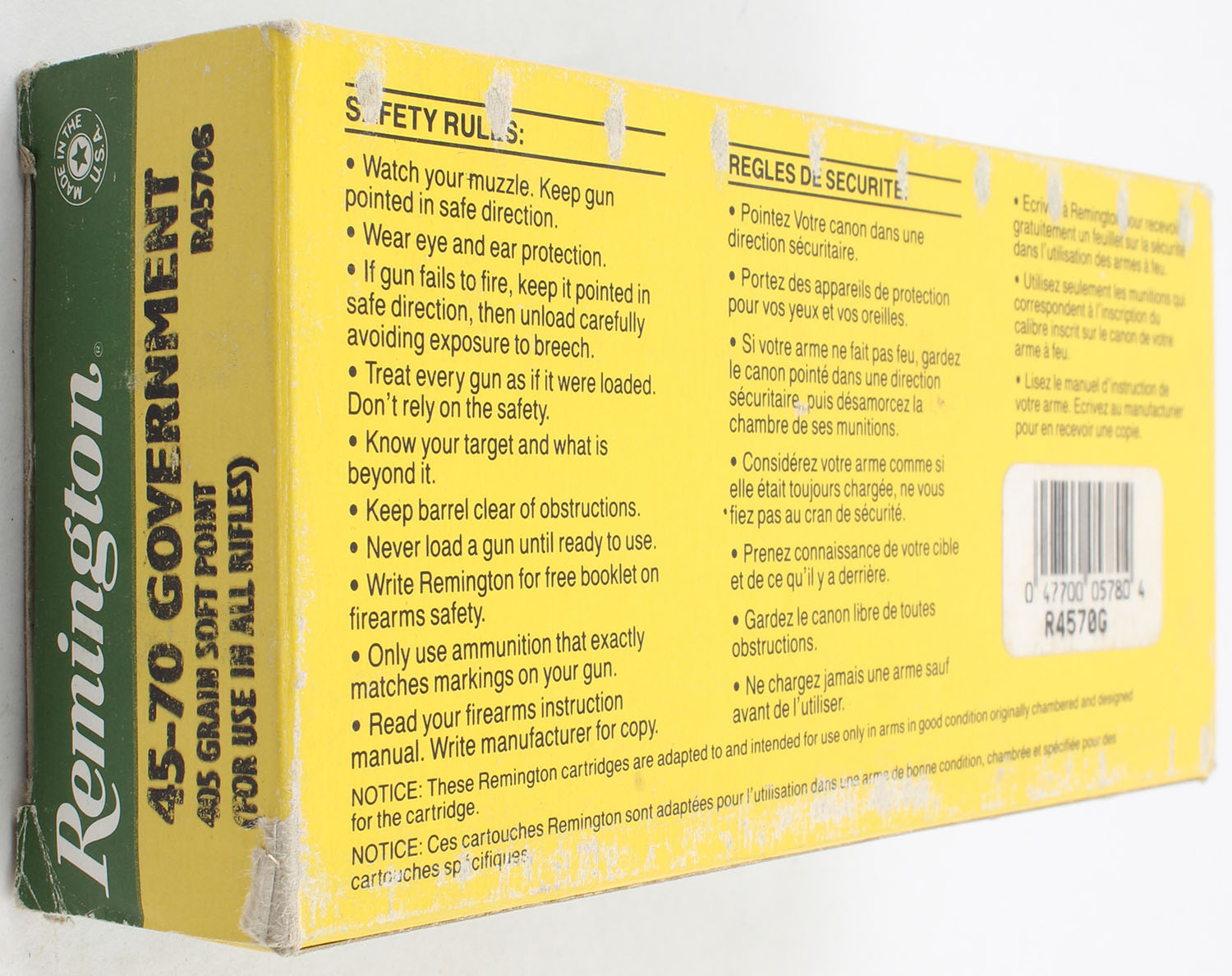 Remington, High Velocity, .45-70 Government, 405 Grain Soft Point, Full, 1pc. Green yellow & white box, box is solid with good color, has scuffing with corner wear, light edge wear, end flaps are solid, ammo is excellent. Grade: Very Good + - Value: 20 to 60