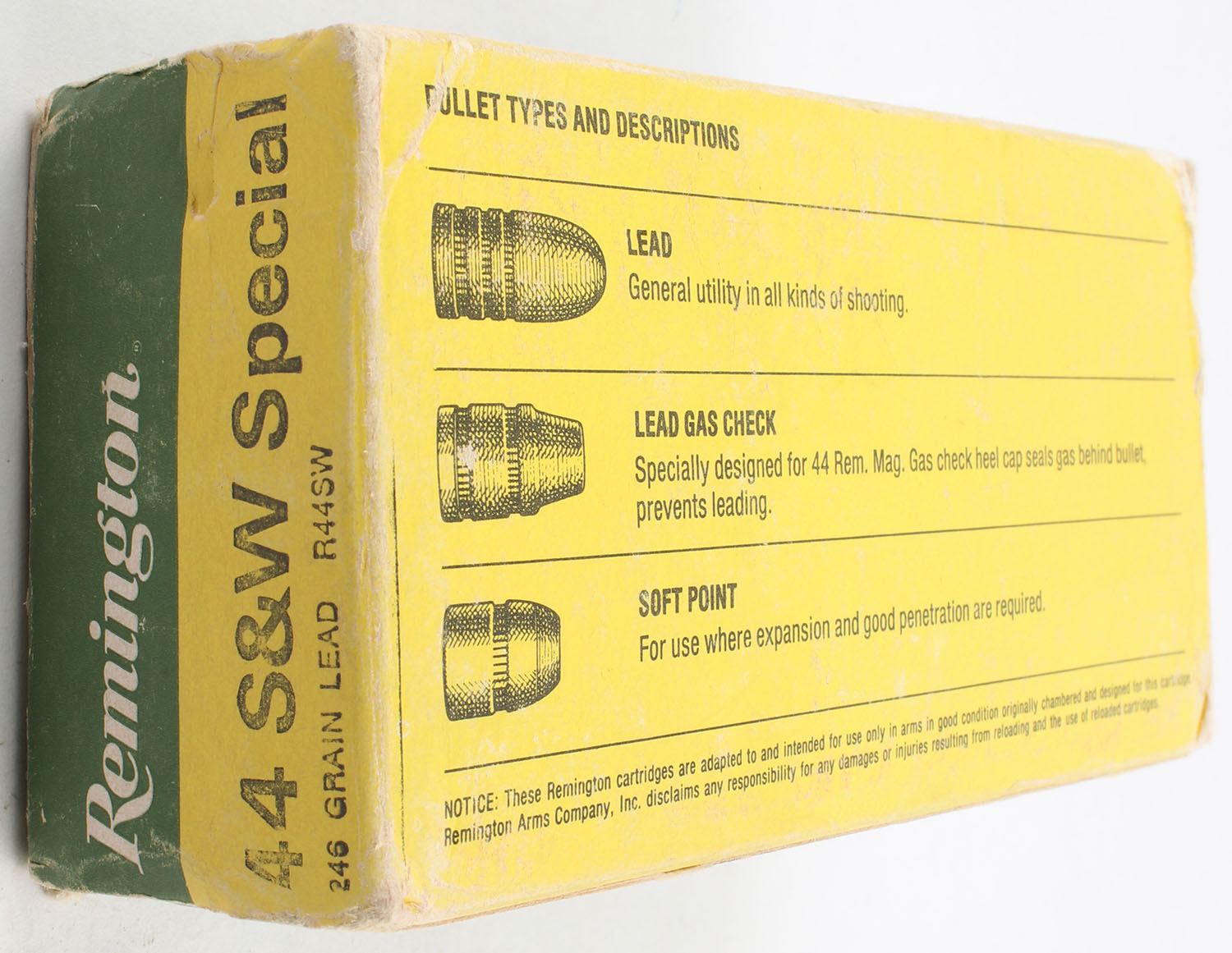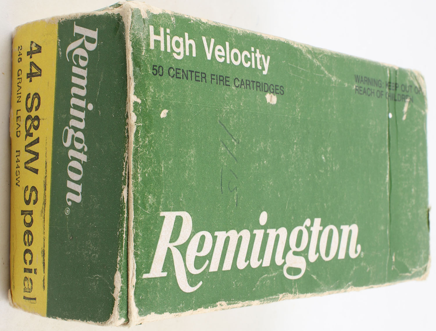 Remington, High Velocity, .44 Smith & Wesson Special, 246 Grain Lead, Full, 1pc. Green & yellow box, box has light age soiling, scuffing, edge & corner wear, end flaps are solid, ammo is excellent. Grade: Very Good - Value: 30 to 60