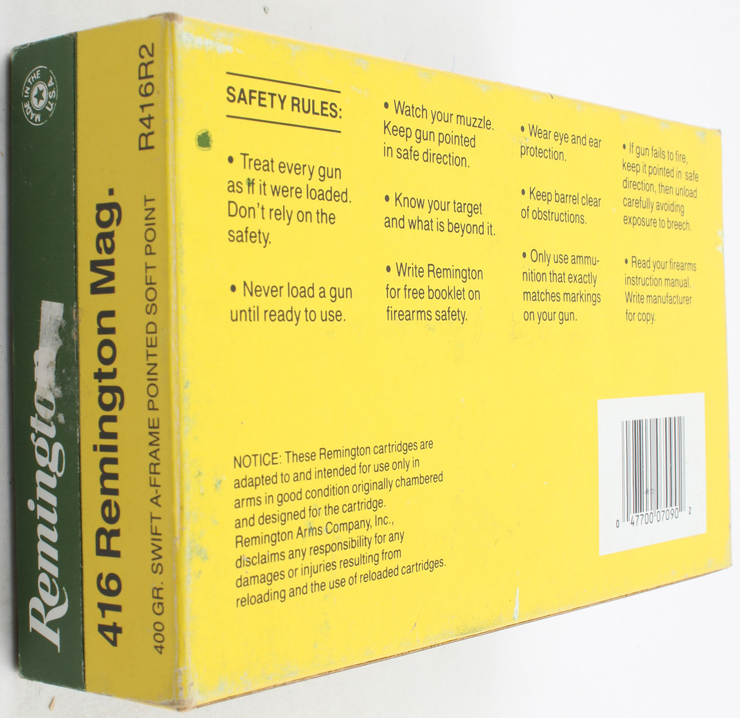 Remington, High Velocity, .416 Remington Magnum, 400 Grain Swift A Fram Pointed Soft Point, Full, 1pc. Green & yellow box, box is very solid with excellent color, has very minor edge & corner wear, end flaps are solid, ammo is excellent. Grade: Excellent + - Value: 40 to 100