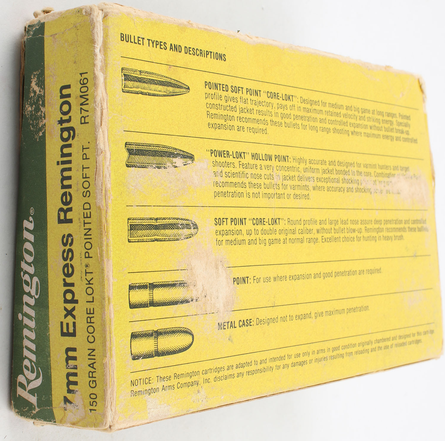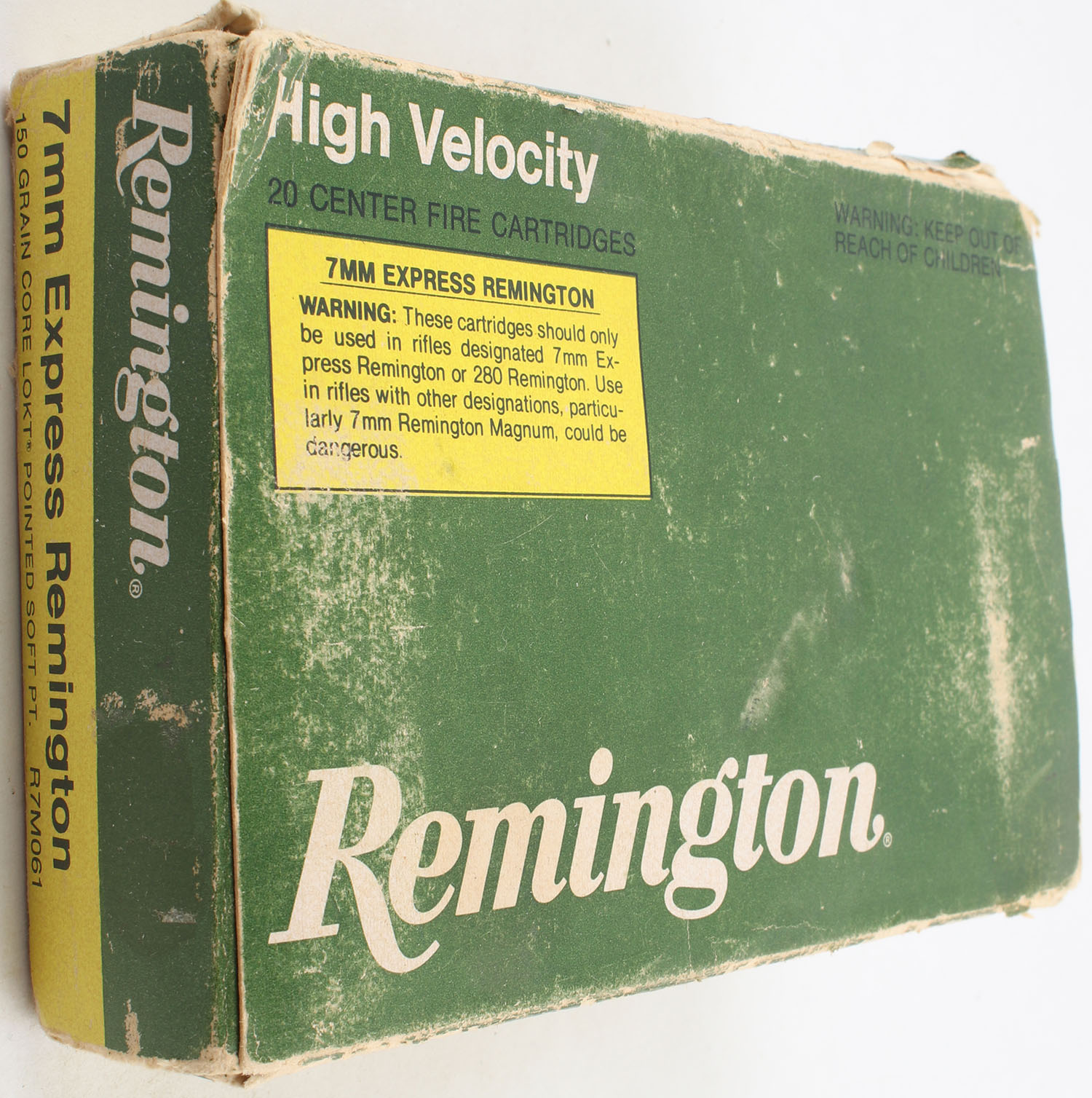 Remington, High Velocity, 7mm Express Remington, 150 Gr. Core-Lokt Pointed Soft P.T. Bullet, 1pc, Full, Green & yellow box, box has light age soiling, scuffing, edge & corner wear, end flaps are solid, ammo is excellent. Grade: Good ++ - Value: 20 to 60