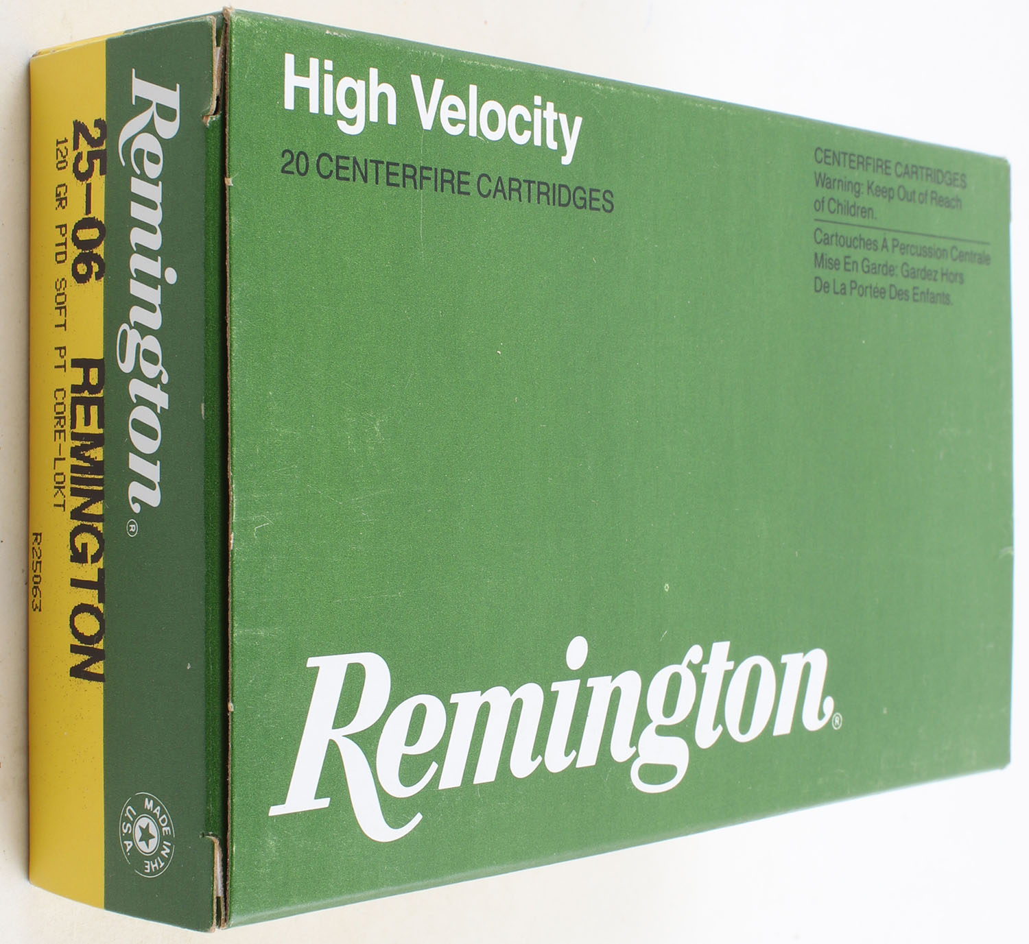 Remington, High Velocity, .25-06 Remington, 120 Grain PTD Soft Point Core Lokt, Full, 1pc. Green & yellow box, box is very solid with excellent color, end flaps are solid, ammo is excellent. Grade: Excellent ++ - Value: 40 to 60
