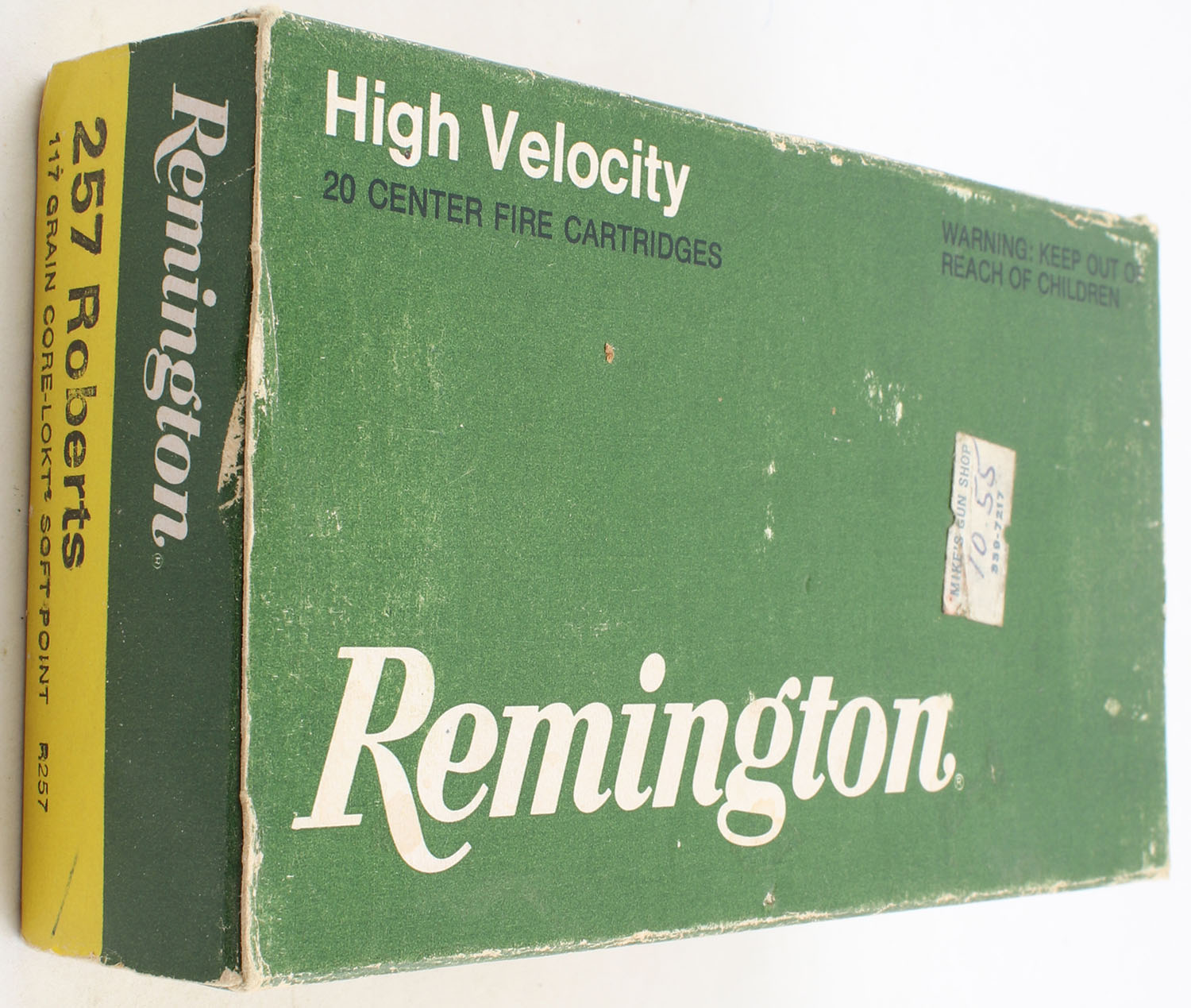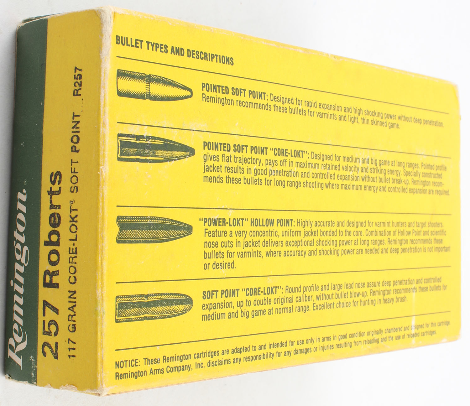 Remington, High Velocity, .257 Roberts, 117 Grain Core Lokt Soft Point, Full, 1pc. Green & yellow box, box is solid, has shelf wear, edge & corner wear, end flaps are solid, ammo is excellent. Grade: Very Good - Value: 20 to 40