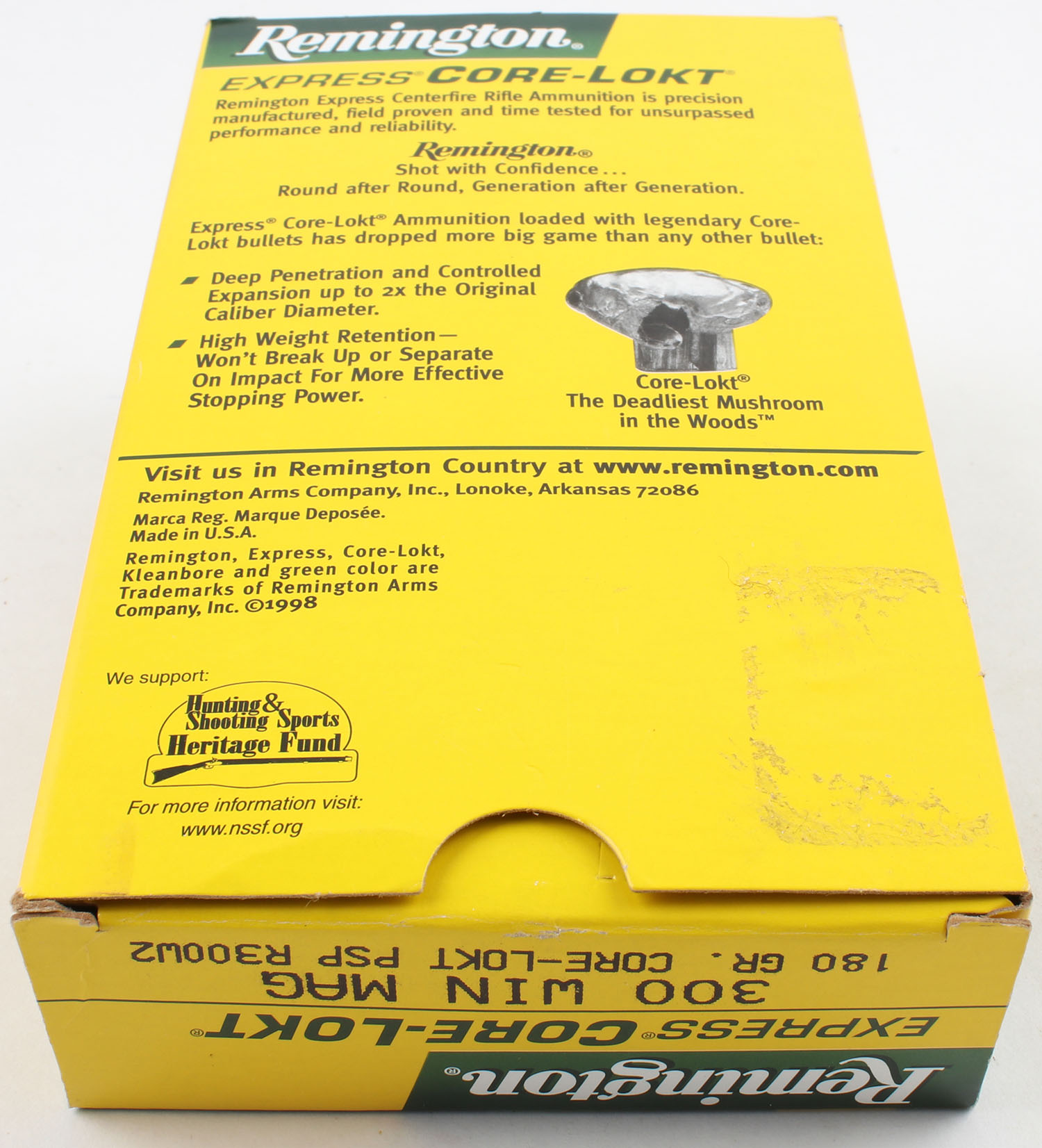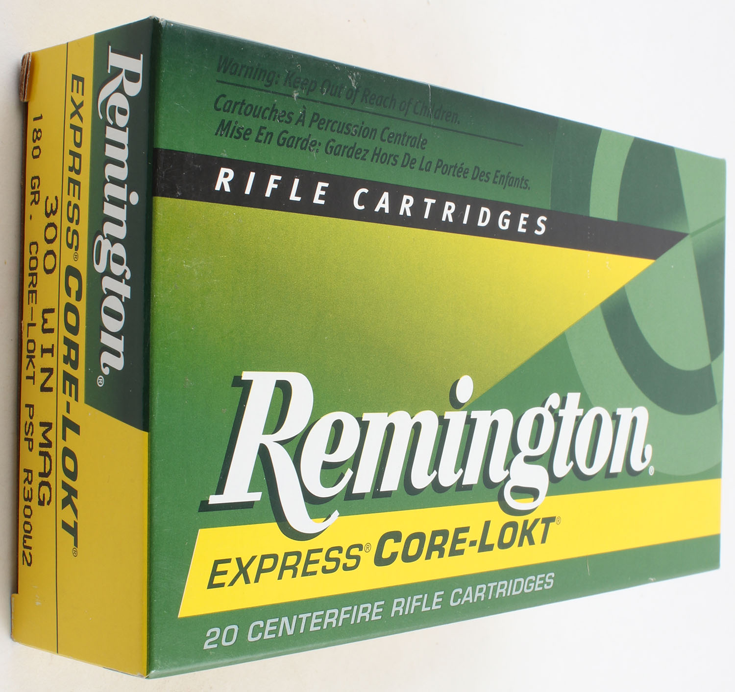 Remington, Express Core-Lokt, .300 Winchester Mag., 180 Grain Core Lokt PSP, Full, 1pc. Multi-colored box, box is very solid with excellent color, end flaps are sealed. Grade: MINT - Value: 20 to 40