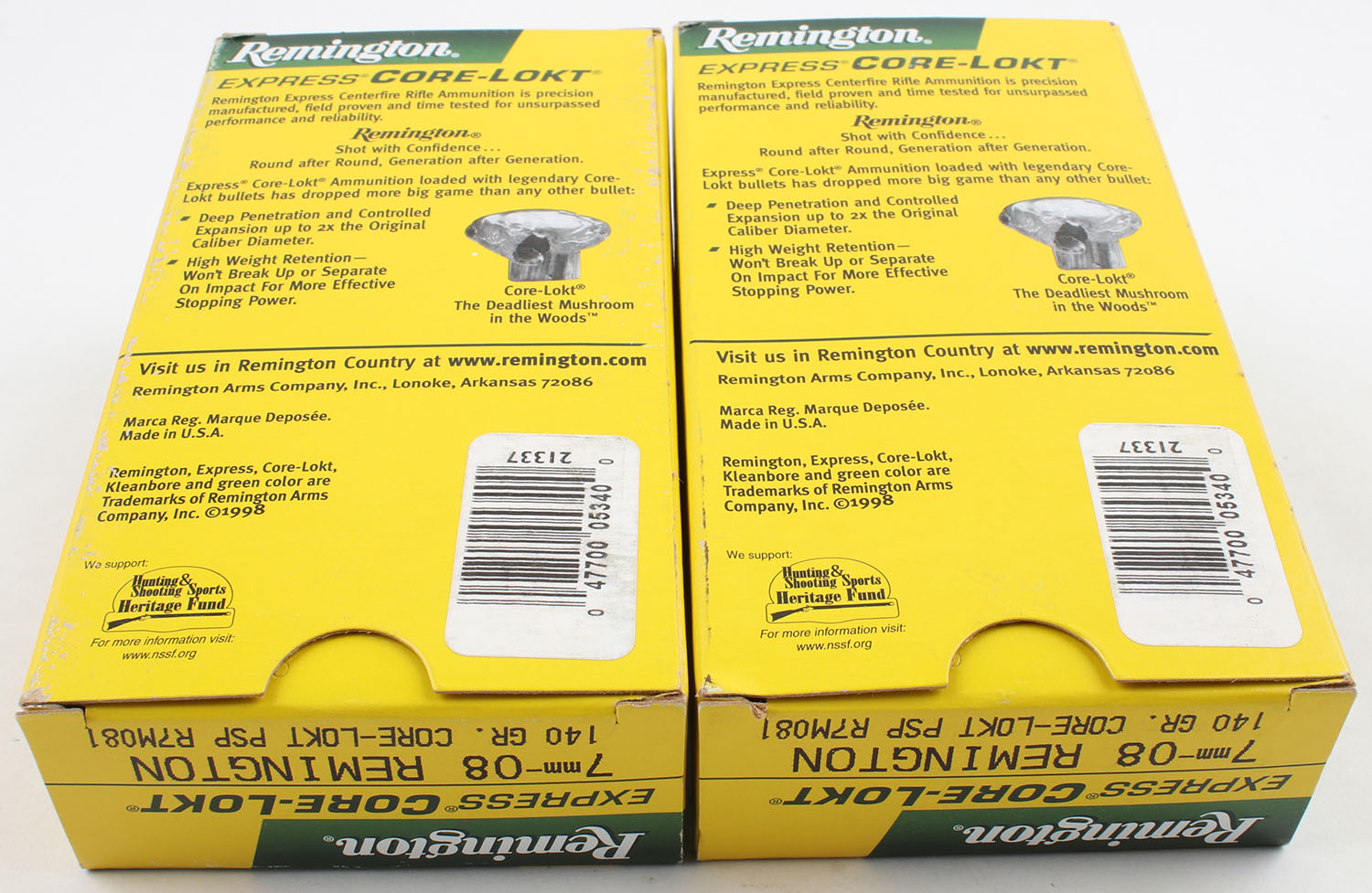 Remington, Lot of (2), 7mm-08 Remington, 140 Grain Core Lokt PSP, Full & Sealed, 1pc. Multi-colored boxes, boxes are very solid with excellent color. Grade: MINT - Value: 40 to 80
