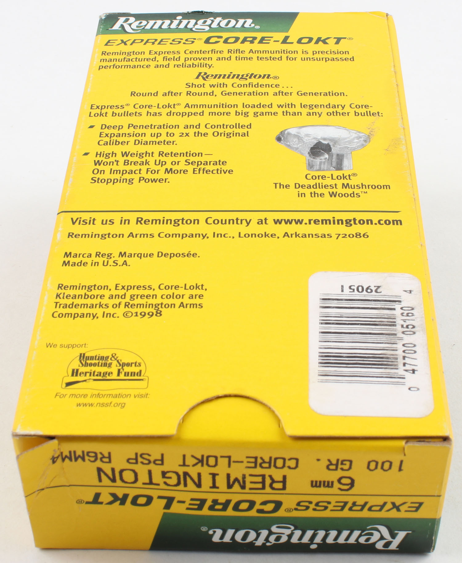 Remington, Express Core-Lokt, 6mm Remington, 100 Grain PSP, Full & Sealed, 1pc. Multi-colored box, box is very solid with excellent color. Grade: Excellent ++ - Value: 40 to 60