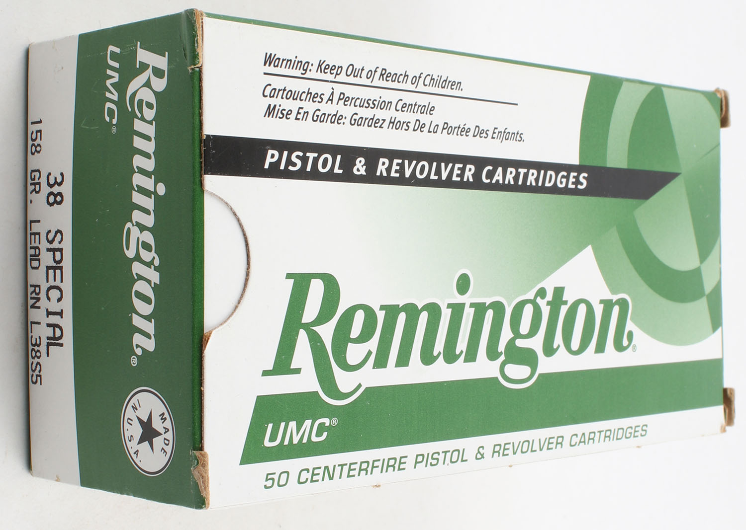 Remington, UMC, .38 Special, 158 Grain Lead RN., Full, 1pc. Green white & black box, box is very solid with excellent color, end flaps are solid, ammo is excellent. Grade: Excellent ++ - Value: 20 to 30