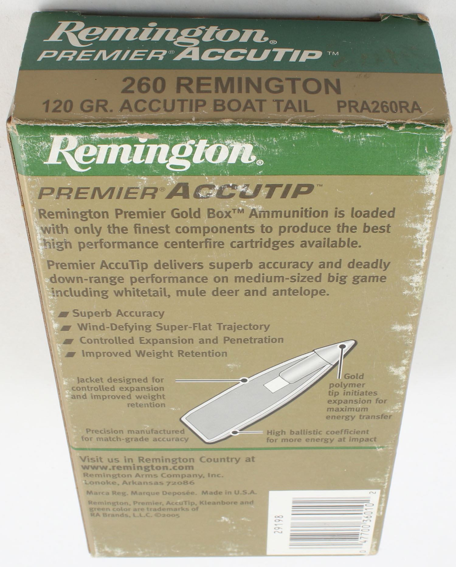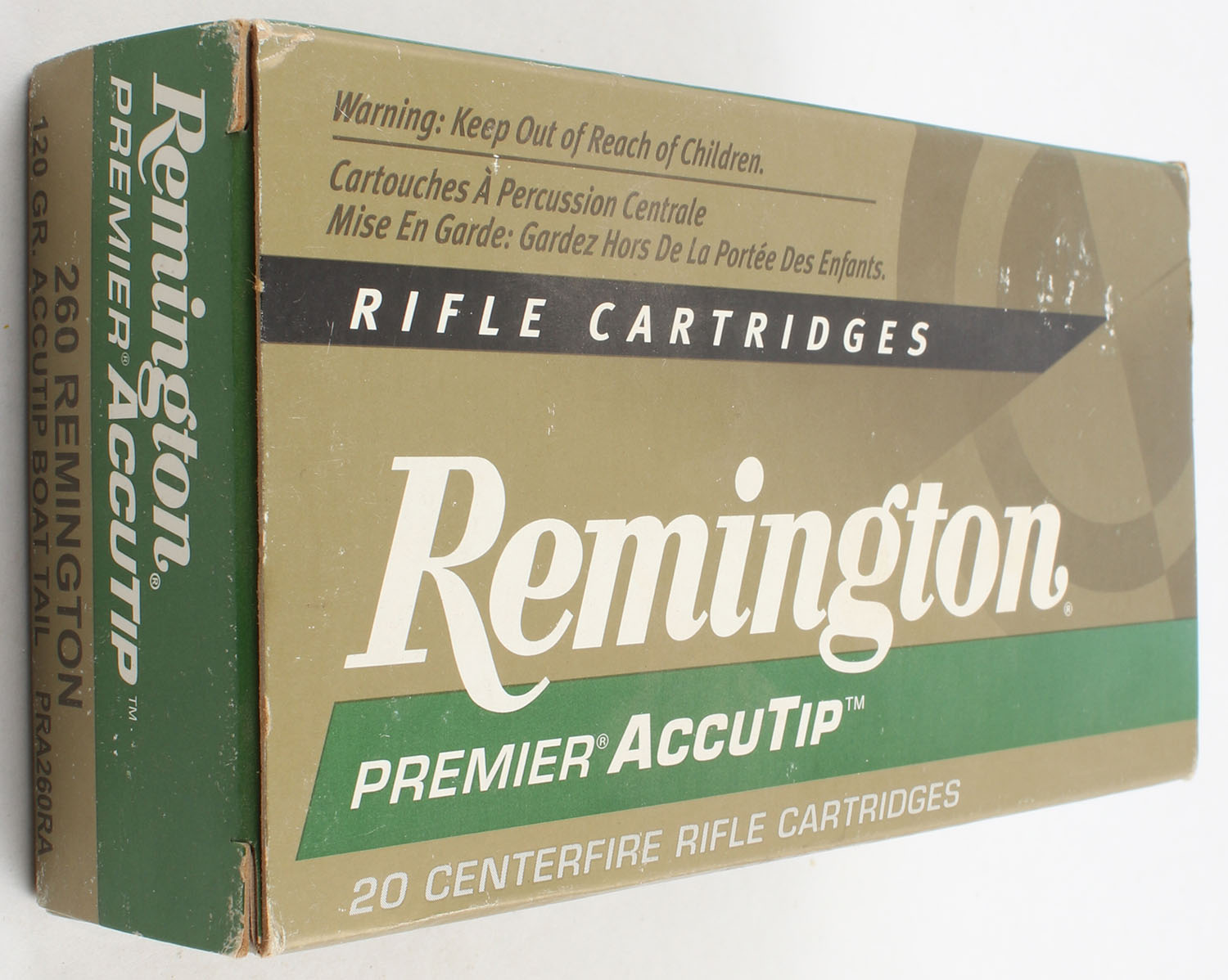 Remington, Premier AccuTip, 260 Remington, 120 Grain AccuTip Boat Tail, Full, 1pc. Gold, green, white & black box, box is very solid with great color, end flaps are solid, ammo is excellent. Grade: Excellent - Value: 20 to 60